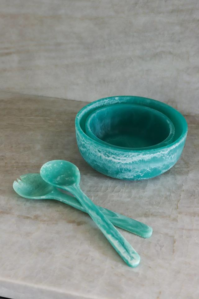 ชามผลไม้ขัดเงาเป็นมิตรต่อสิ่งแวดล้อมทำด้วยมือจากชามสลัดหินอ่อนเรซินพร้อมช้อนเซิร์ฟเวอร์เวลา2ของขวัญทางธุรกิจ