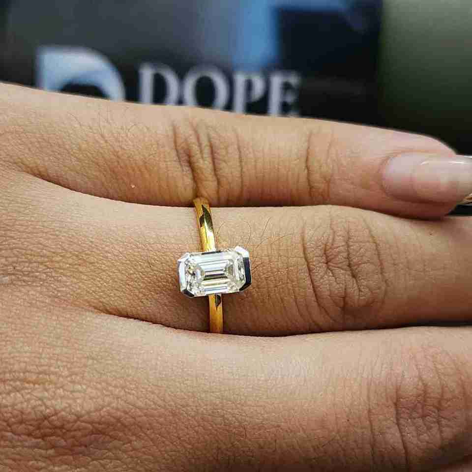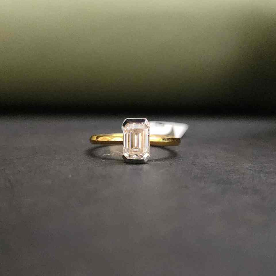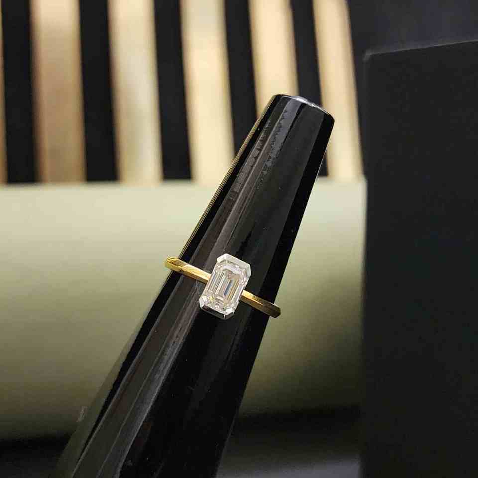 แหวนทองคำแท้ 18KT ประดับมอสซาไนต์ทรงเหลี่ยมสีเหลือง ดีไซน์พิเศษ พร้อมการฝังเพชรแบบ Pave ได้รับการรับรองจาก IGI เหมาะสำหรับเป็นแหวนหมั้น ใช้ได้ทั้งผู้หญิงและผู้ชาย