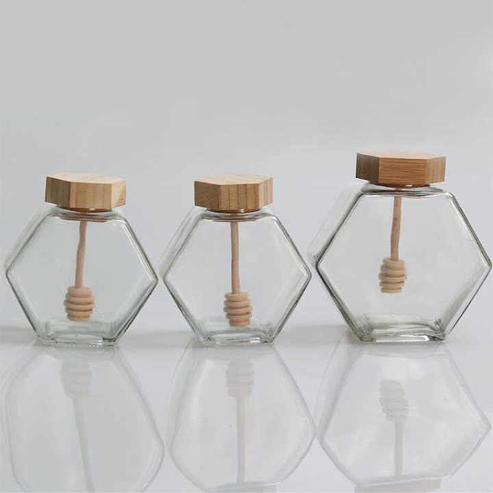 เหยือกแก้วทรงหกเหลี่ยมสำหรับน้ำผึ้งโถน้ำผึ้งทำจากไม้กระบวย