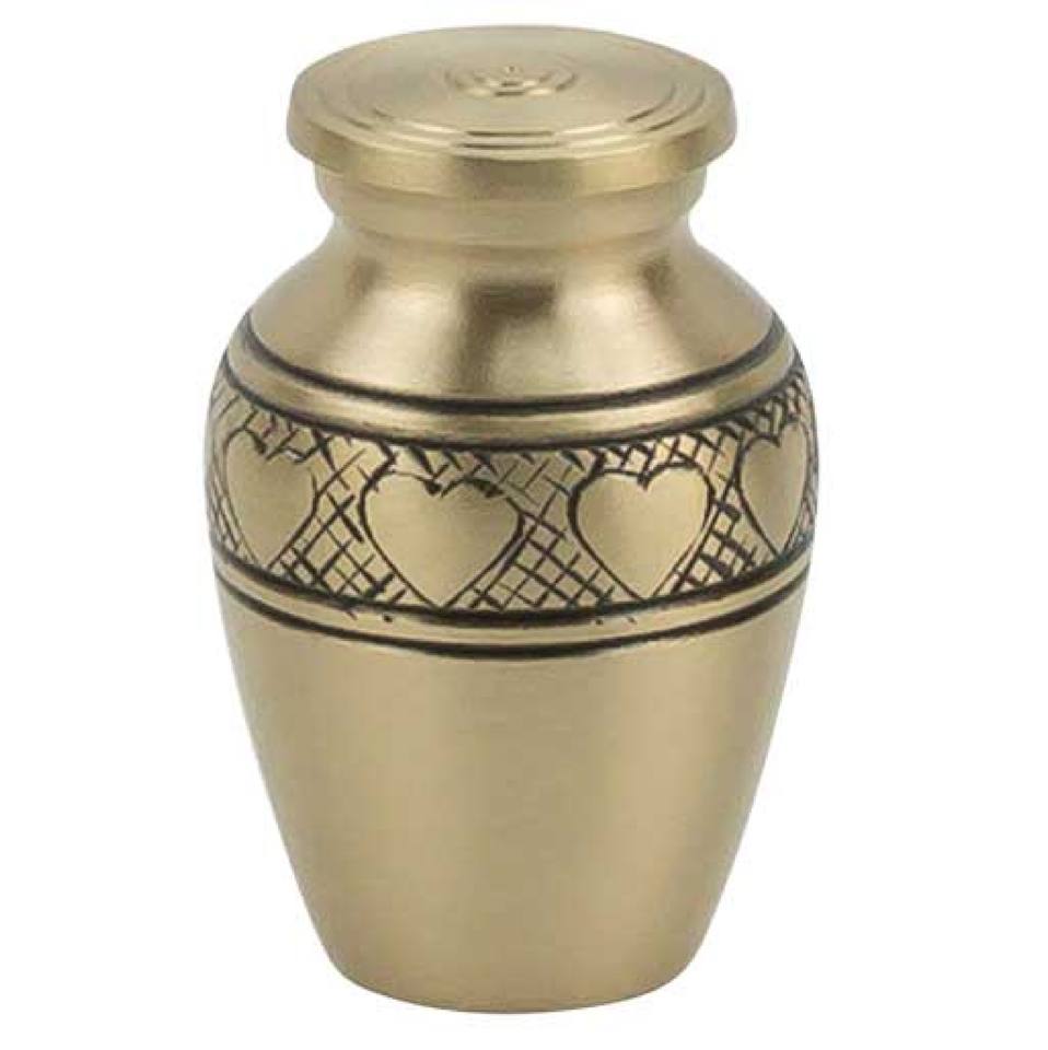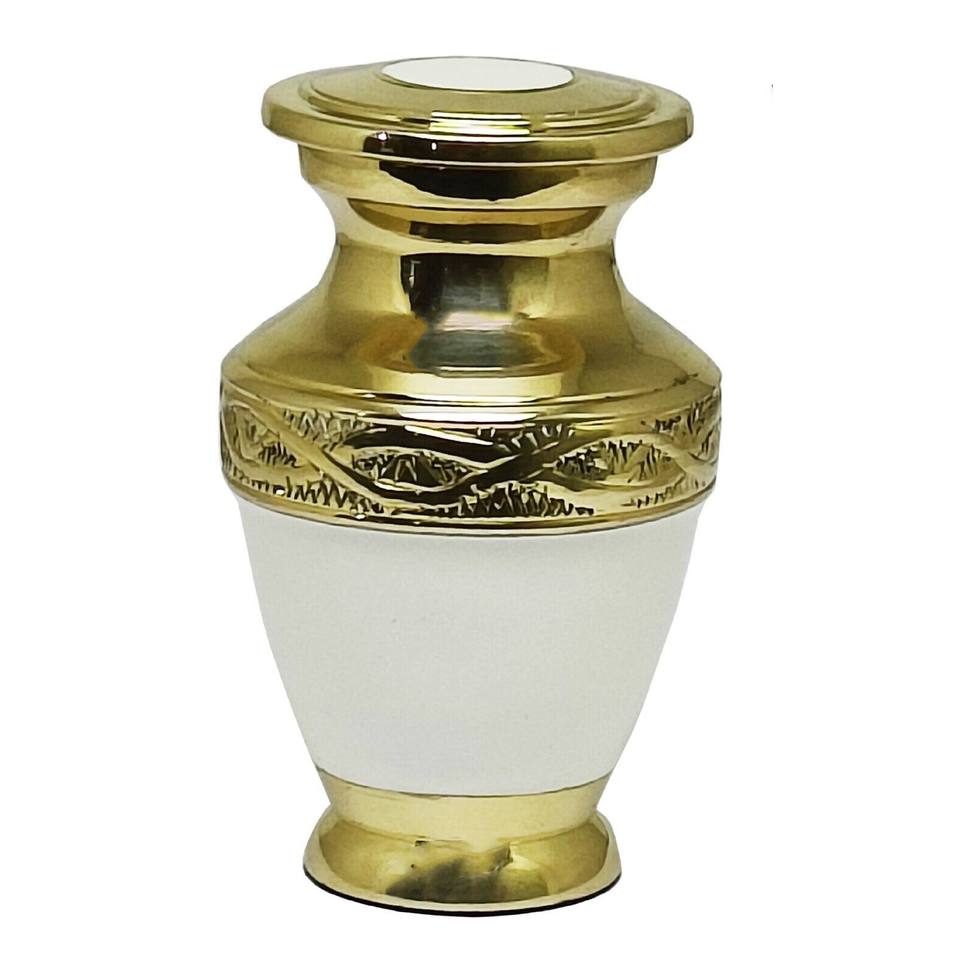 โกศทองเหลืองพร้อมสายรัดแกะสลักสีทองและสีเทาสำหรับขี้เถ้าของมนุษย์ดูไม่เหมือนใคร