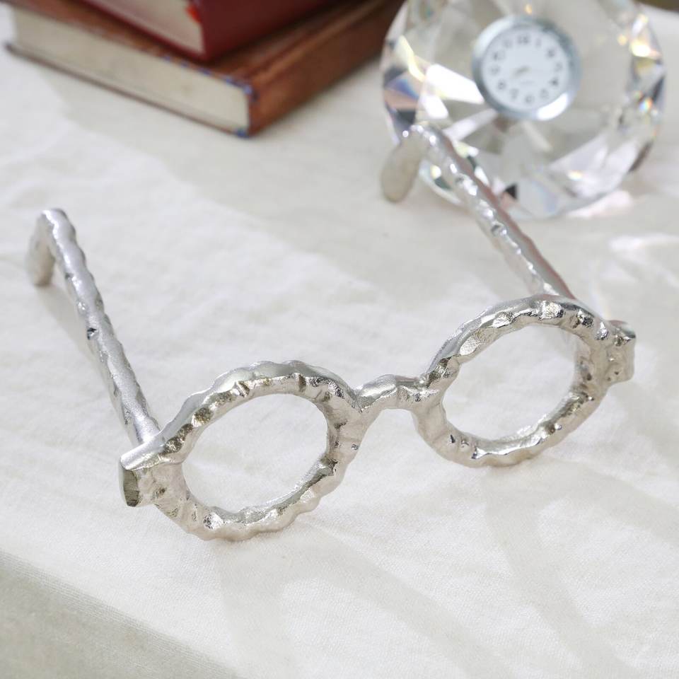 รูปปั้นฐานแว่นกันแดดทำจากโลหะที่เป็นเอกลักษณ์สำหรับตกแต่งโต๊ะในบ้านประติมากรรมอลูมิเนียมชุบเงินคุณภาพสูง