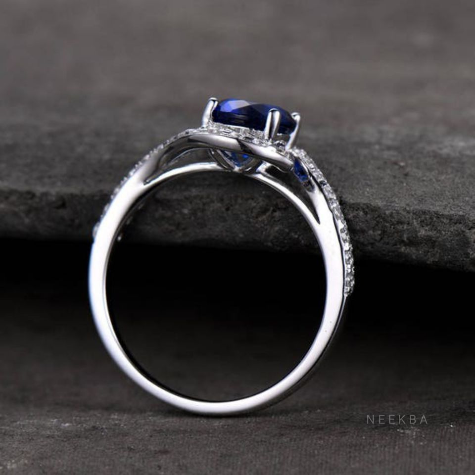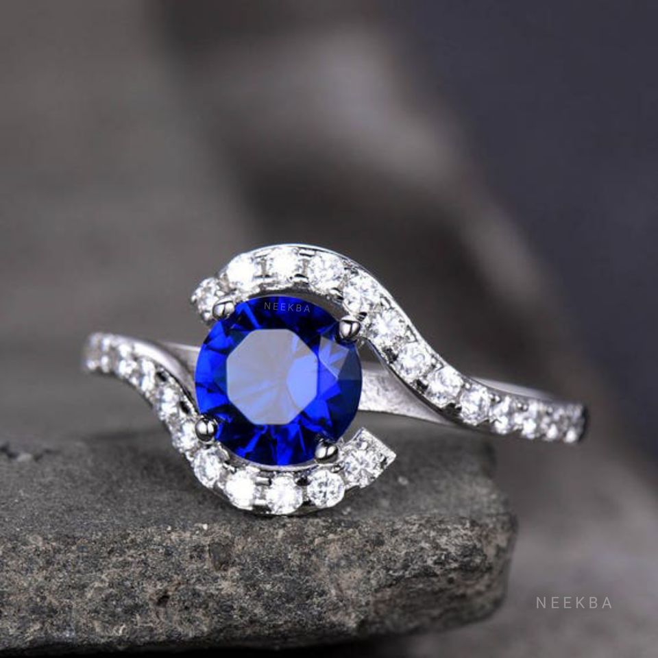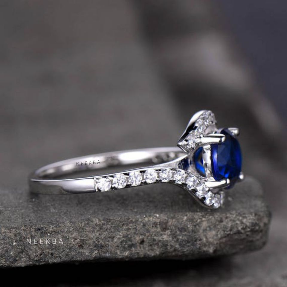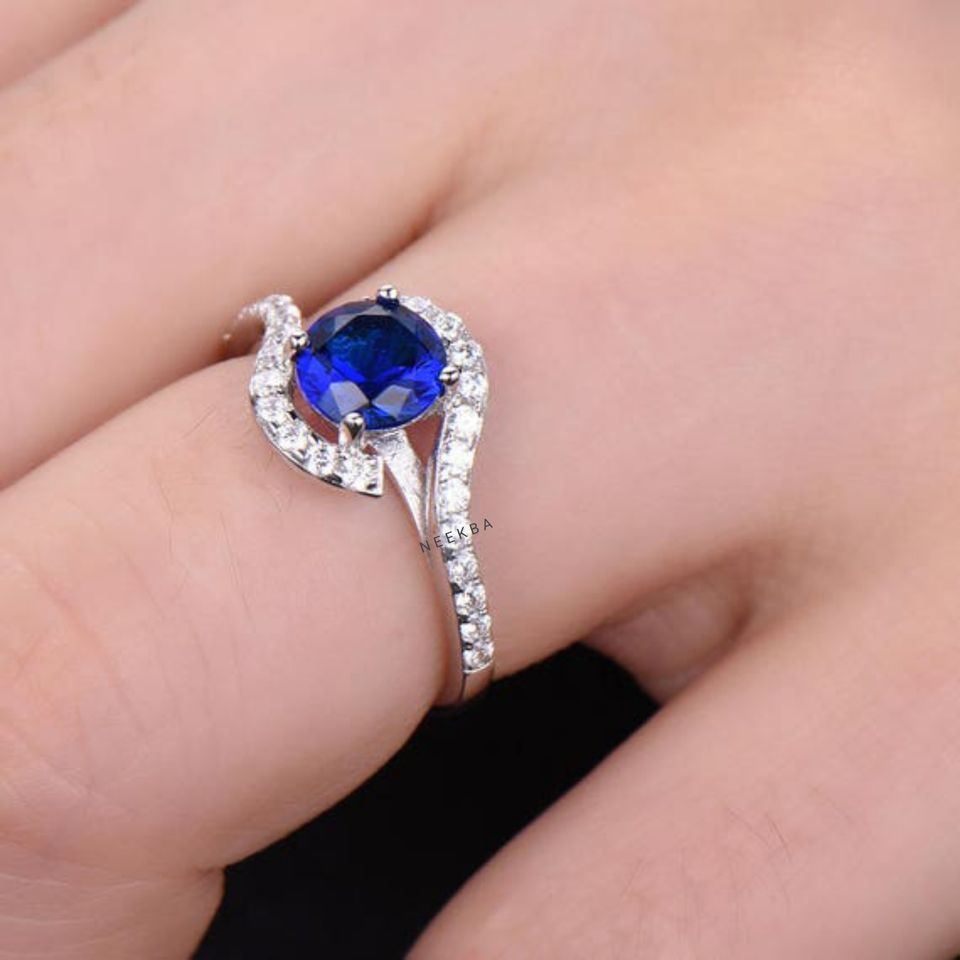 แหวนฮาโลครึ่งเพชรมอสซาไนต์ที่มีเอกลักษณ์กลม6มม. แหวนไพลินสีน้ำเงินที่ปลูกในห้องปฏิบัติการแฮนด์เมด14K แหวนแต่งงานสีขาวล้วน