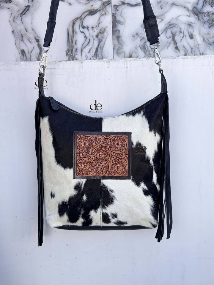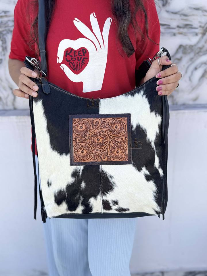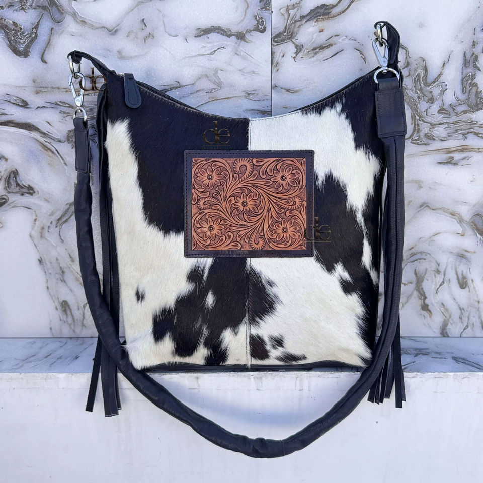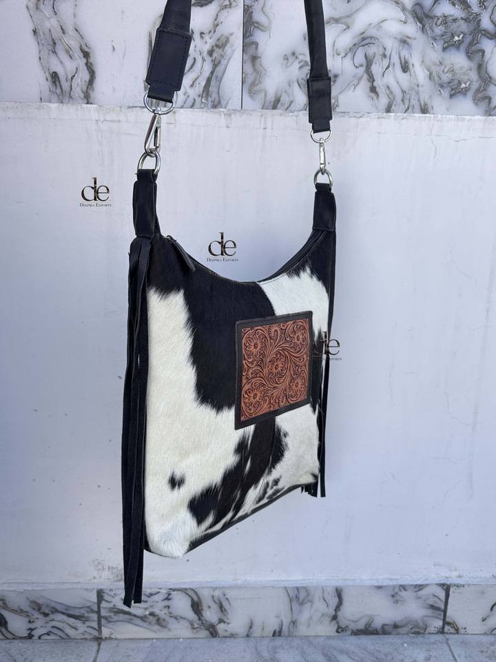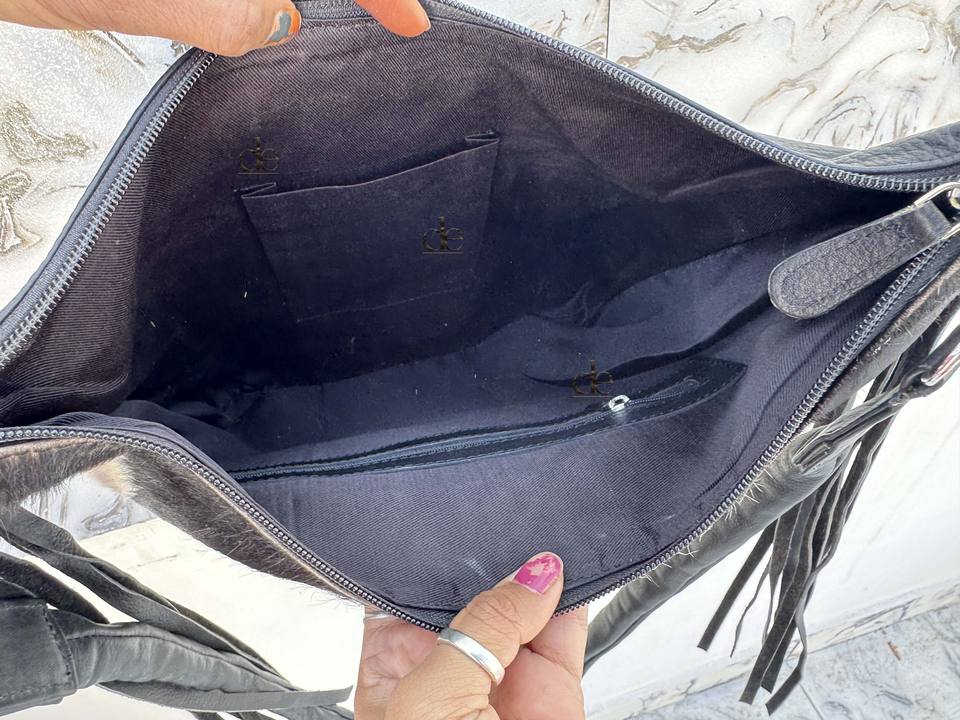 กระเป๋าหนังวัวลายพิเศษ แต่งพู่หนัง สะพายข้าง/สะพายไหล่ ดีไซน์เก๋ กระเป๋าถือหนังแท้ ตกแต่งลายด้วยมือ สำหรับผู้หญิง ใช้งานได้หลากหลาย
