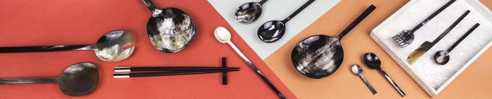 ผลิตภัณฑ์ที่ไม่เหมือนใคร ช้อนส้อมทำจากเขาควายสีดำและกระดูกสีขาว เป็นมิตรต่อสิ่งแวดล้อม ใช้กับเครื่องล้างจานได้ อุปกรณ์ทำสลัดสำหรับใช้ในครัวเรือน ผลิตในอินเดีย