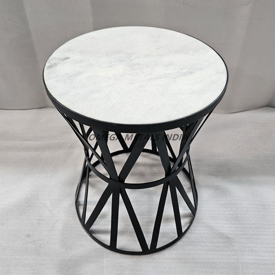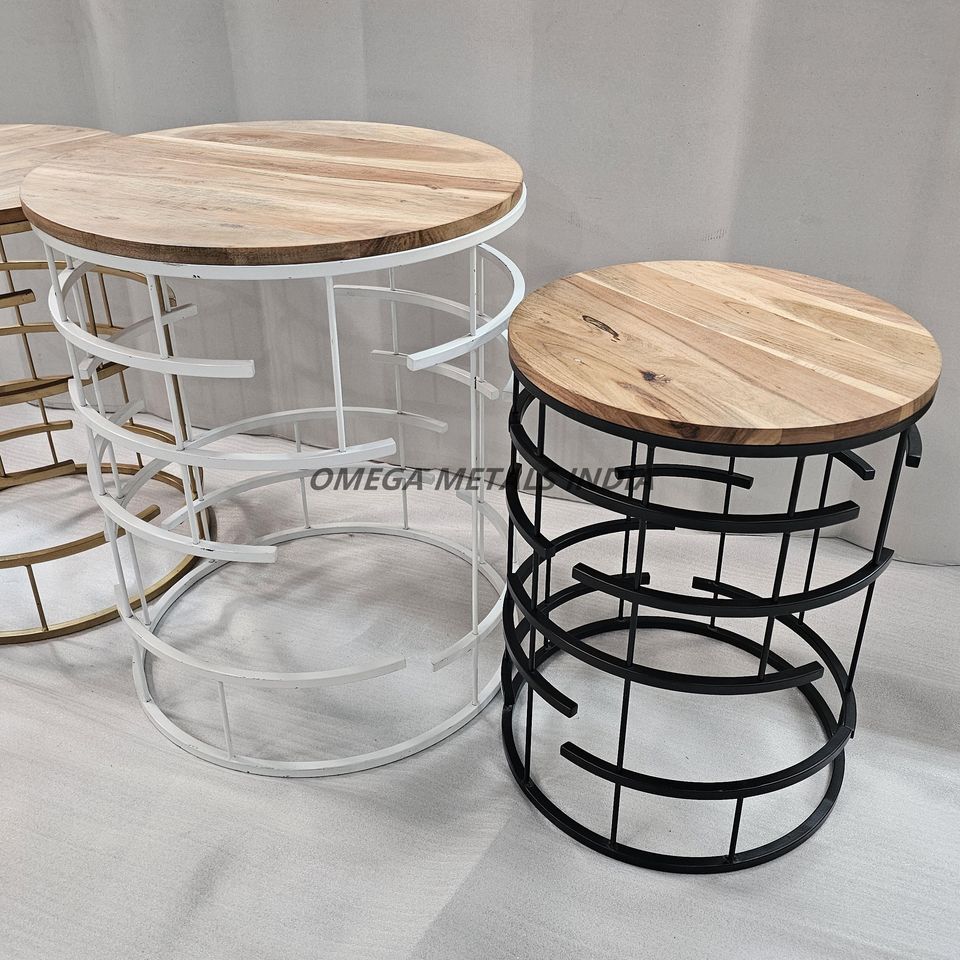 ฐานกรอบโลหะรูปทรงเรขาคณิตที่ทันสมัยชุดโต๊ะกาแฟกลมที่มีเอกลักษณ์พร้อมท็อปไม้สีดำสีทองสีขาวสำหรับบ้านและสำนักงาน