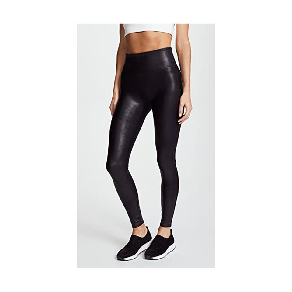 กางเกงหนังเรียบง่ายไม่ซ้ำใครของผู้หญิง,กางเกงหนังเทียมทรงสกินนี่กันน้ำวินเทจเอวสูงสีพื้น