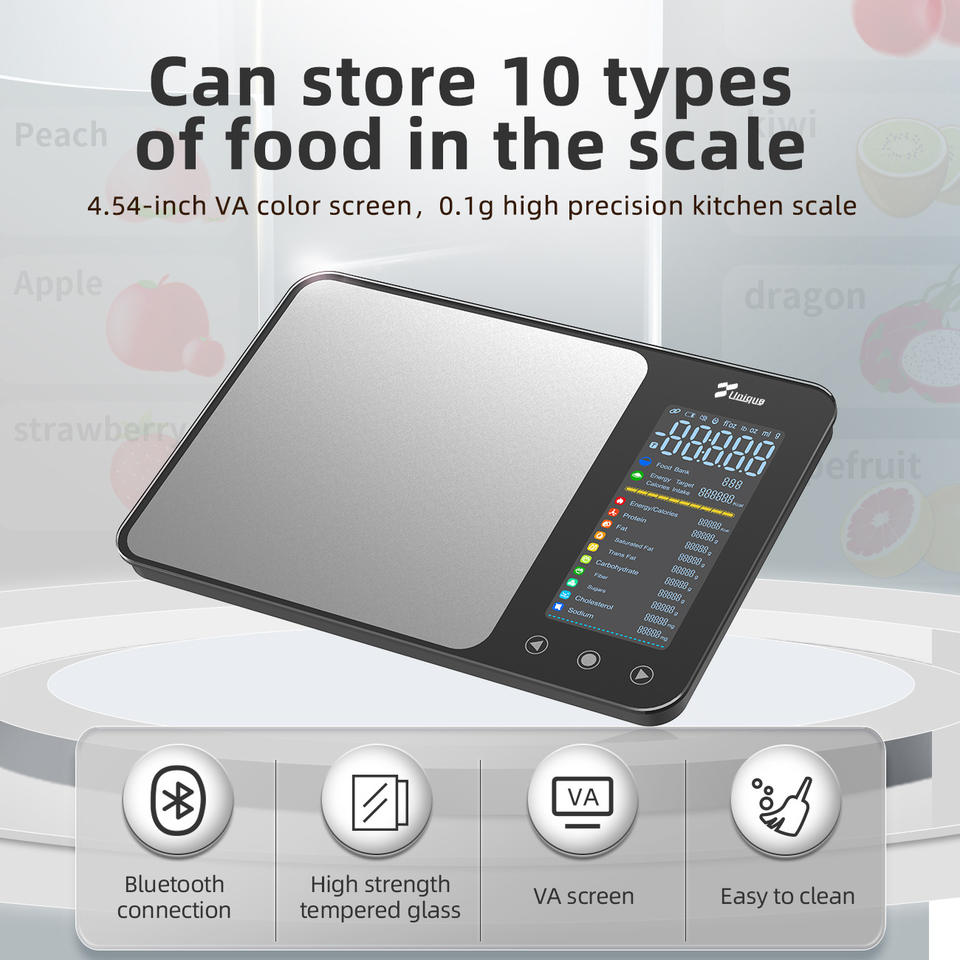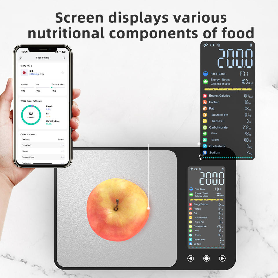 เครื่องชั่งครัวอัจฉริยะรุ่น CK869BLE ดีไซน์โลหะ พร้อมระบบควบคุมผ่านแอปพลิเคชัน หน้าจอ LCD แสดงผลแบบมีไฟพื้นหลัง สำหรับติดตามคุณค่าทางโภชนาการและแคลอรี่
