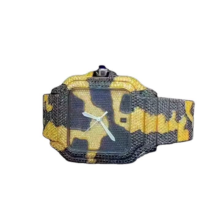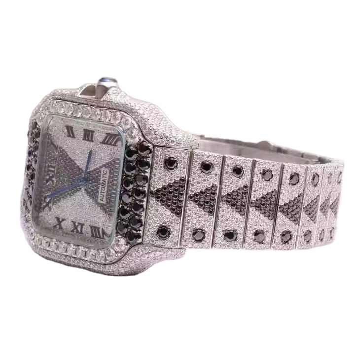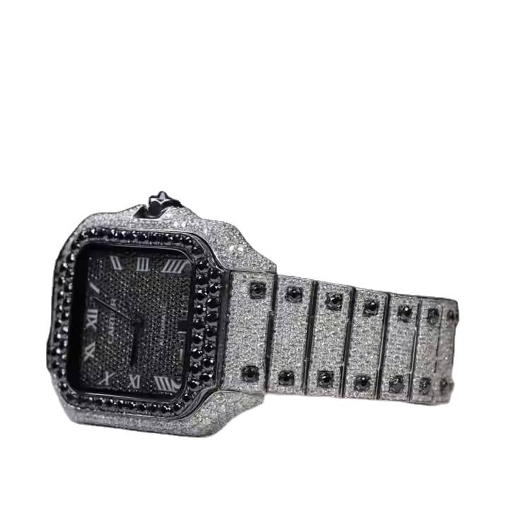นาฬิกาสไตล์ที่เป็นเอกลักษณ์ของผู้ชายนาฬิกาสแตนเลสสตีลเพชรสีขาวและสีดำดูหรูหรานาฬิกาควอตซ์ธุรกิจลำลอง
