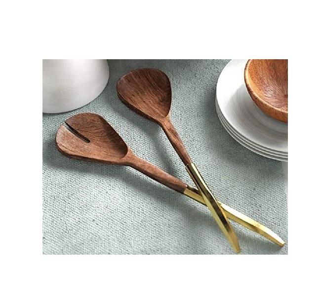 ช้อนตักสลัดไม้และส้อมอุปกรณ์เสริฟบนโต๊ะอาหารทันสมัยเซิร์ฟเวอร์สลัดไม้มะม่วงพร้อมที่จับซิม