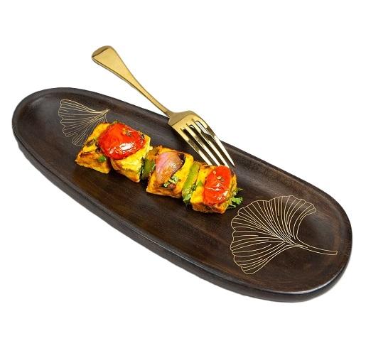 จานไม้เสิร์ฟอาหารทำจากไม้ที่มีเอกลักษณ์เฉพาะสำหรับโรงแรม/ร้านอาหารถาดไม้หรูหราดีไซน์คลาสสิกถาดชาและกาแฟจากไม้มะม่วงสำหรับเครื่องครัว