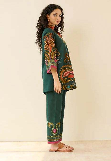 ชุดสองชิ้นเสื้อคอวีและกางเกงขากว้างชุดผ้าฝ้ายพิมพ์ลายดอกไม้สีสันไม่เหมือนใคร