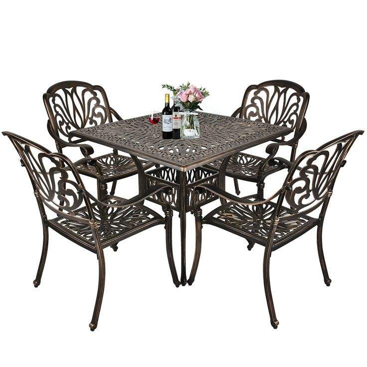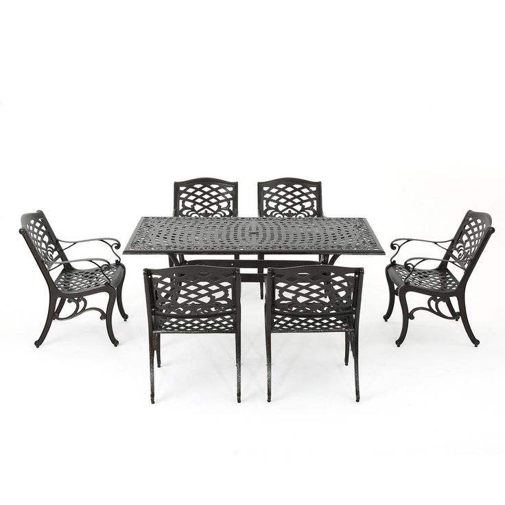 โต๊ะเหล็กหล่อมีเก้าอี้หกตัวที่เหมาะกับสภาพอากาศและสวนแนววินเทจ