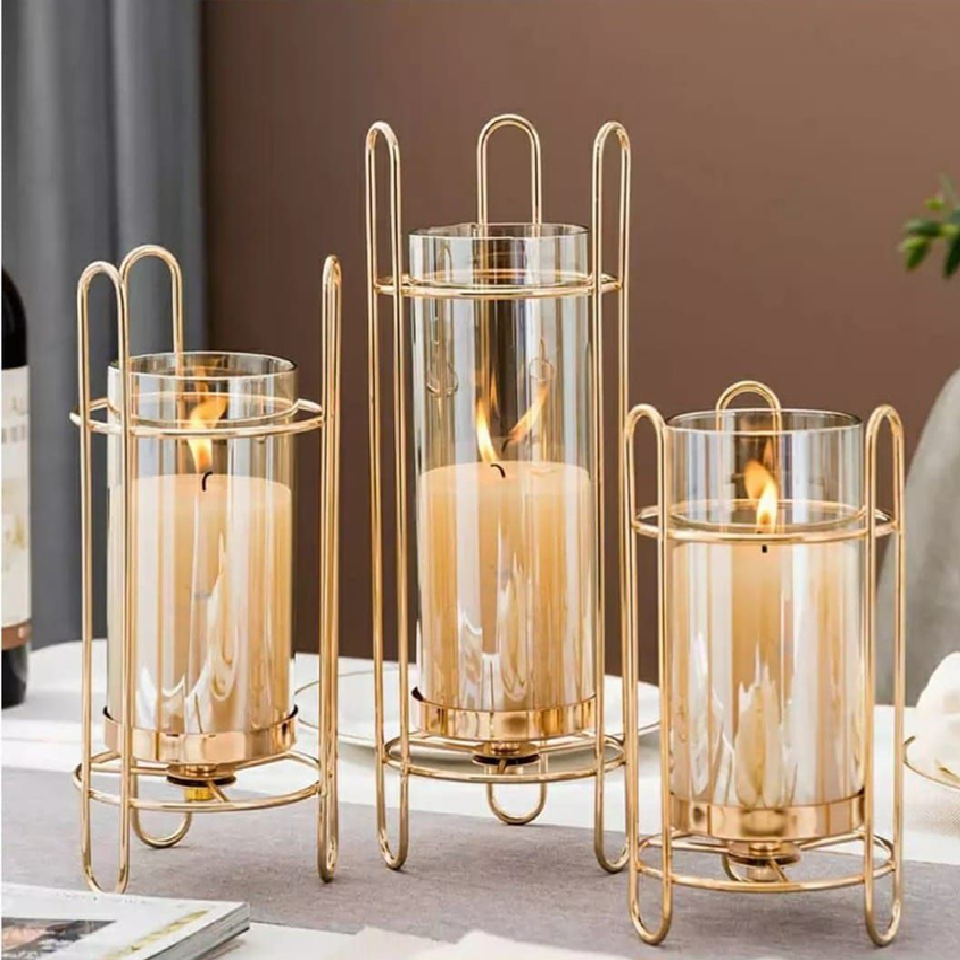 เชิงเทียนทรงรีสีทองแบบแขวน ดีไซน์เก๋ไก๋พร้อมตะขอรูปคลื่นและกระจกสี มีจำหน่ายในราคาขายส่ง