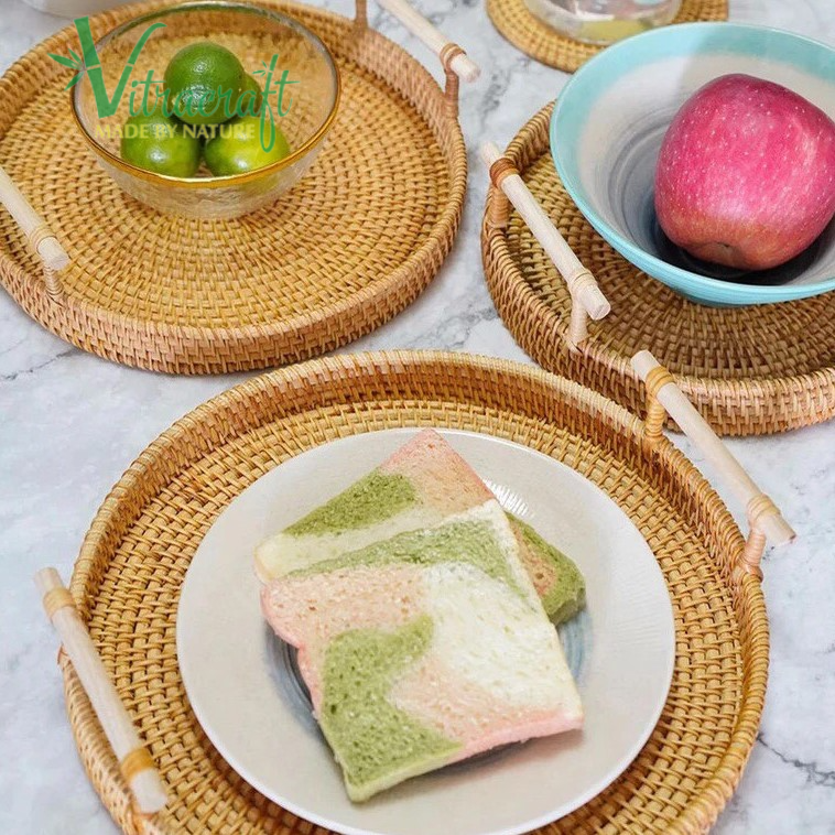 Unique handmade products Set of 3 handmade woven bamboo and rattan trays Round rattan tray with handle Size D38-D40-D42cm