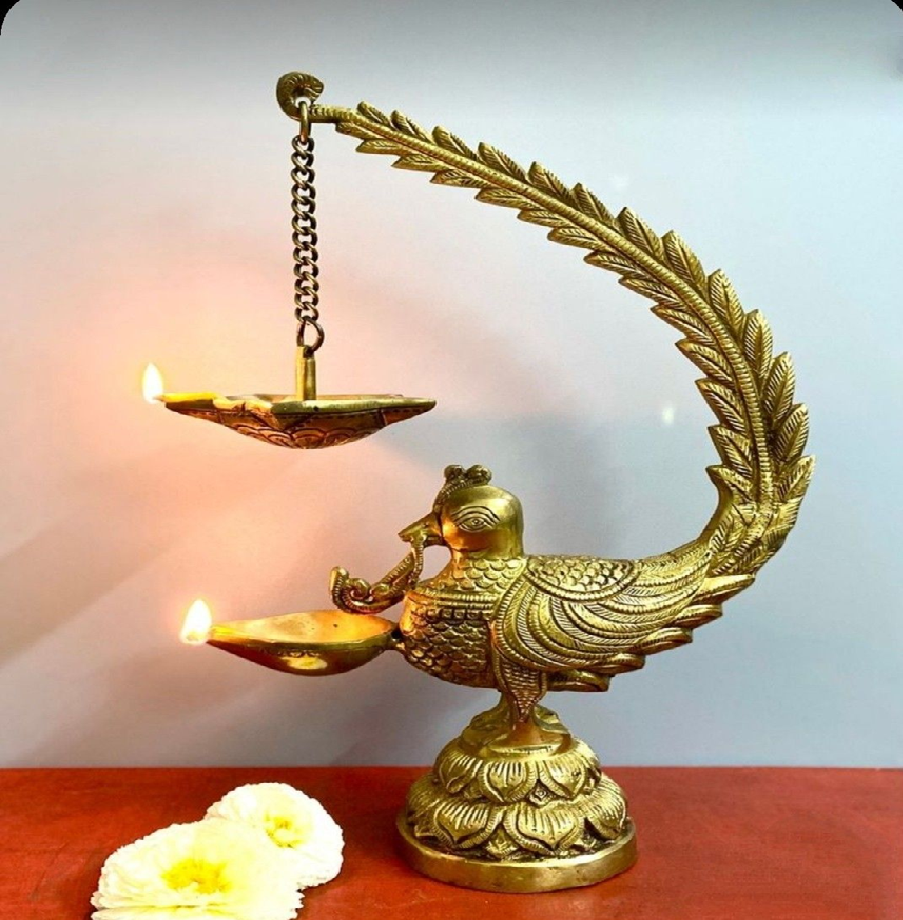 ตะเกียงทองเหลืองรูปนกยูงที่มีเอกลักษณ์เฉพาะตัว พร้อมโคมไฟน้ำมันแบบแขวนและรายละเอียดขนนกที่ประณีต มีจำหน่ายในราคาขายส่ง