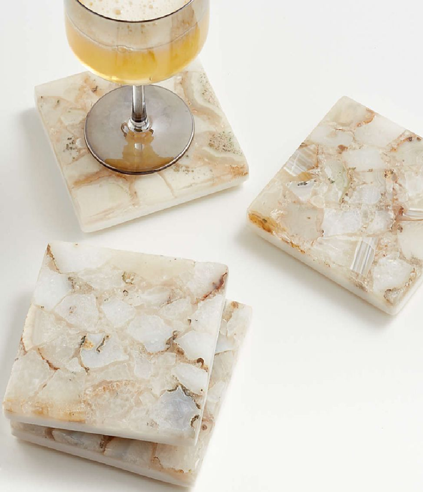 Unique square white crystal quartz and natural stone collage coasters, perfect for home decor, available at wholesale prices.