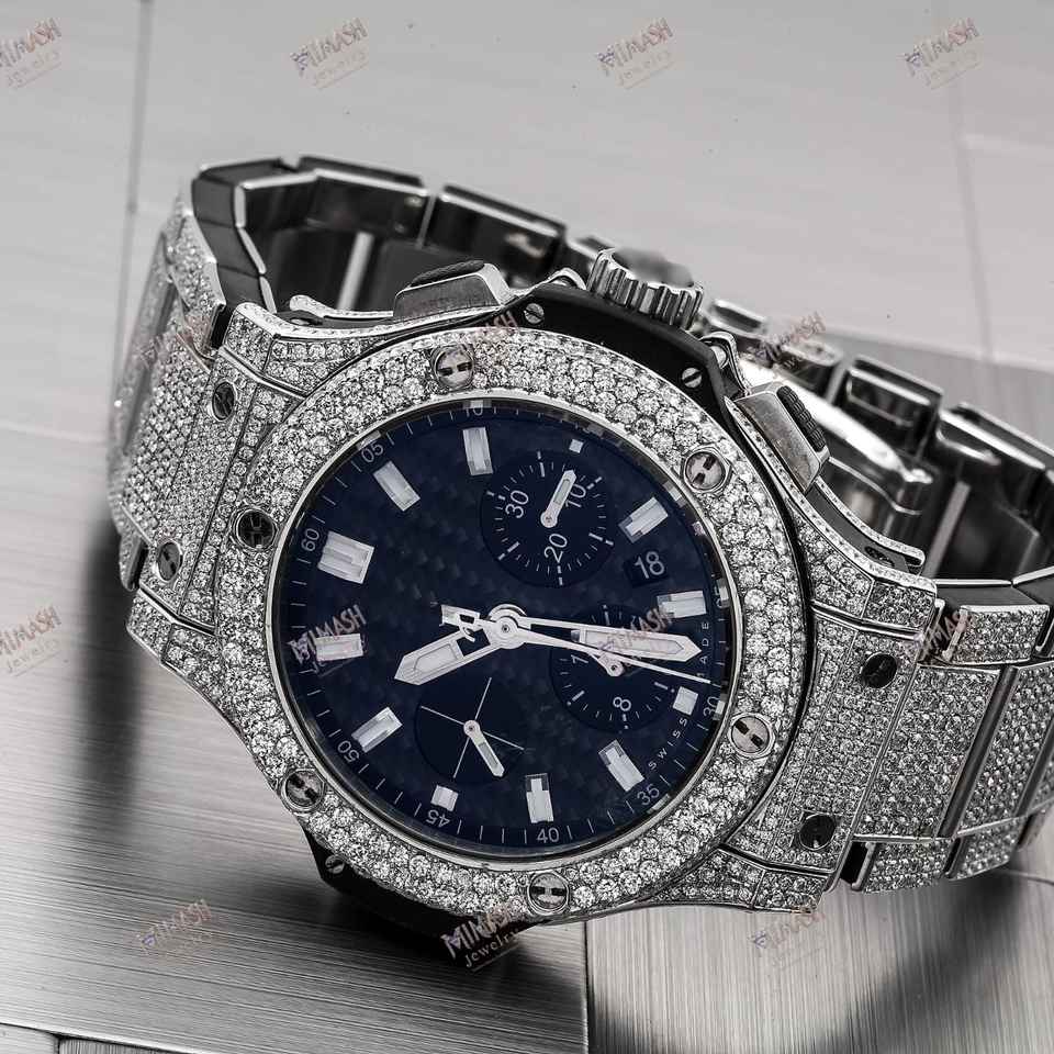 นาฬิกาเพชรแบบอัตโนมัติหรูหราที่สร้างขึ้นอย่างไม่เหมือนใครสีน้ำเงินโครโนกราฟวันที่แบบโบราณสองเขตเวลานาฬิกาข้อมือหน้าปัดย่อยแบบเต็มเย็น