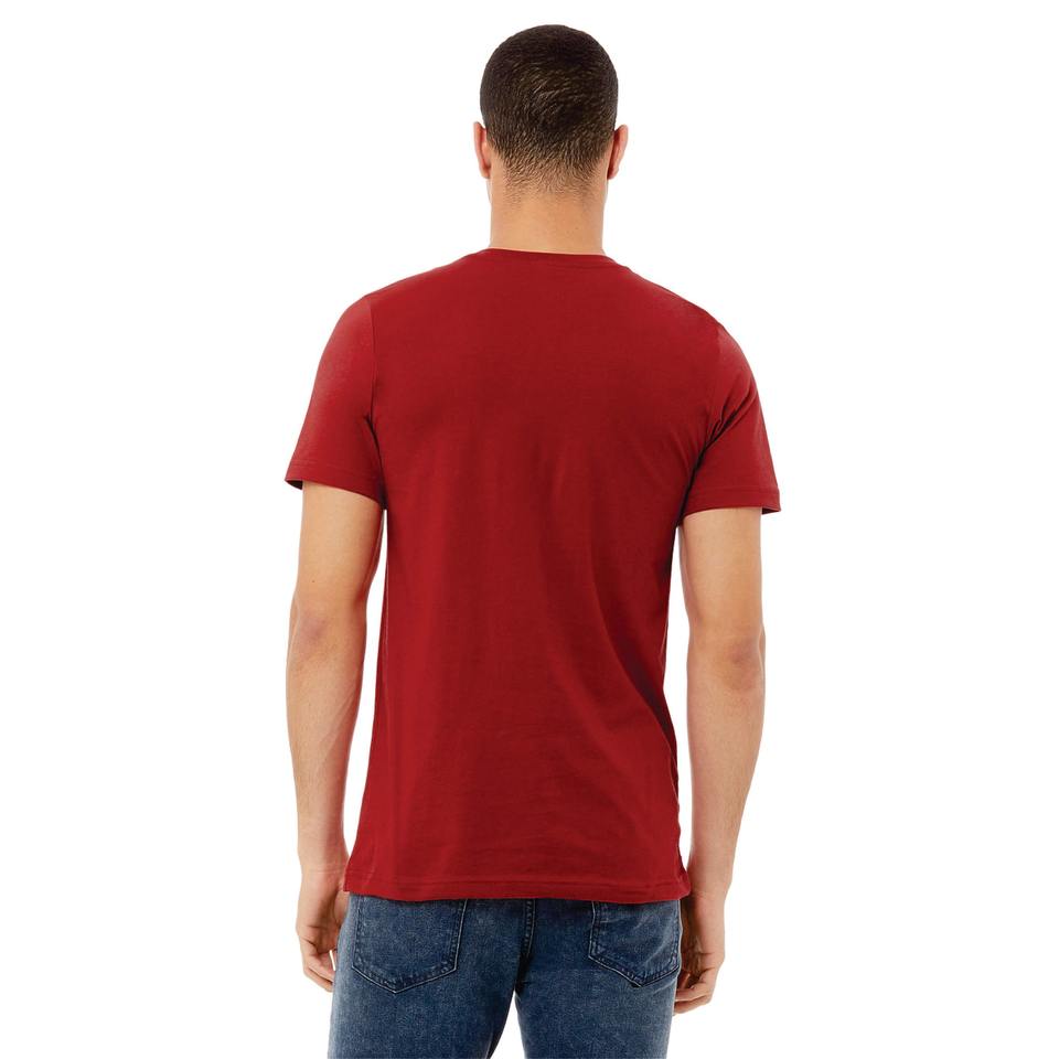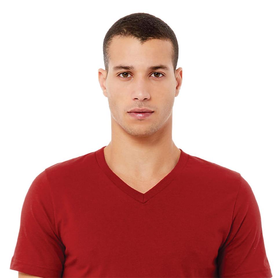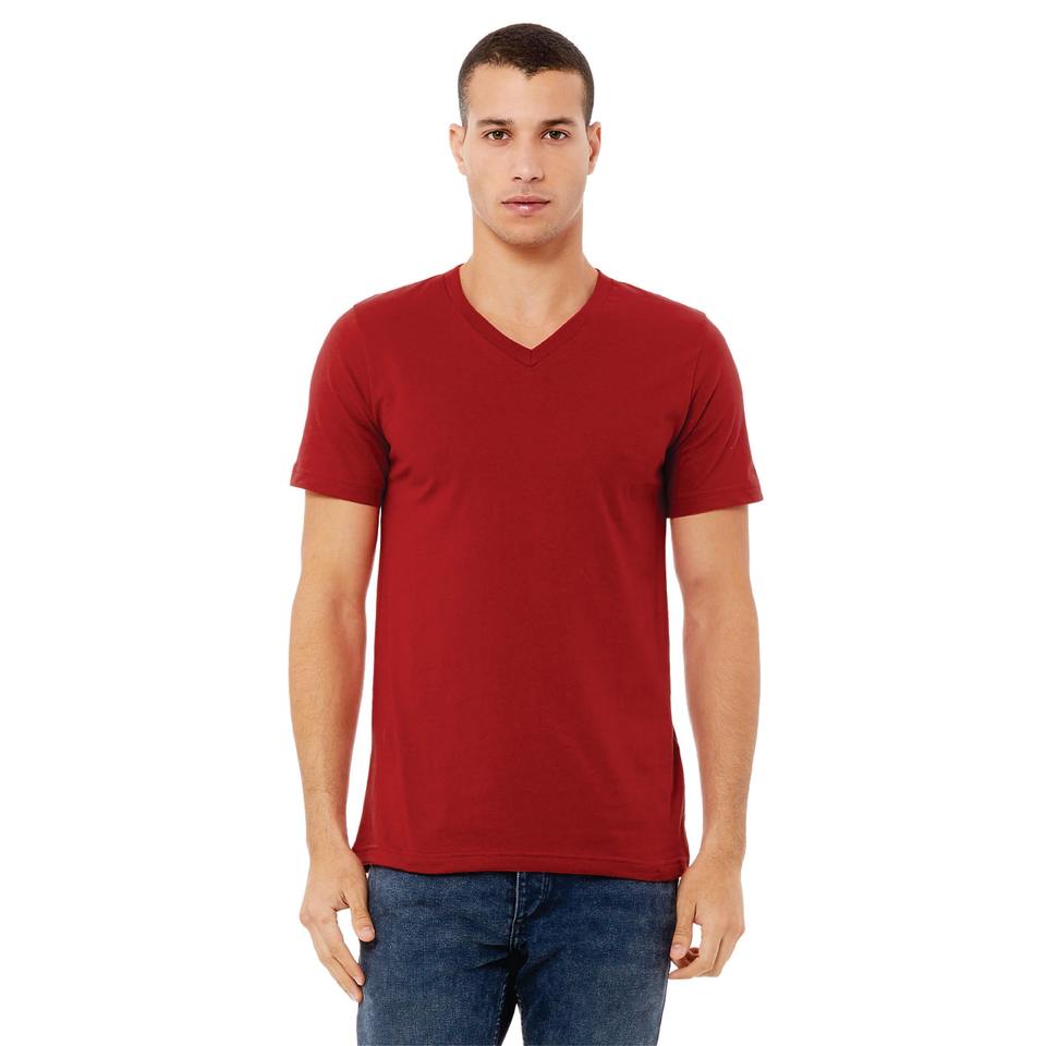 เสื้อยืดแขนสั้นคอวีคอวีสำหรับทั้งชายและหญิงทำจากผ้าฝ้ายแบบ100% 4.2ออนซ์ผ้าทอลายผ้าใบสีแดงใส่ได้ทั้งชายและหญิง