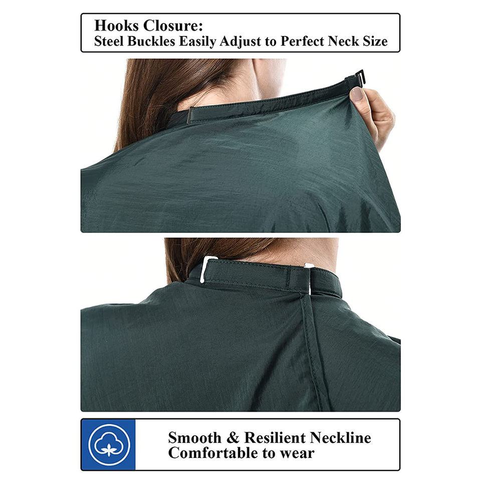 ผ้าคลุมตัดผมสำหรับทุกเพศผ้าไนลอนโพลีเอสเตอร์ผ้าคลุมสำหรับร้านเสริมสวยพร้อมหัวเข็มขัดเหล็ก