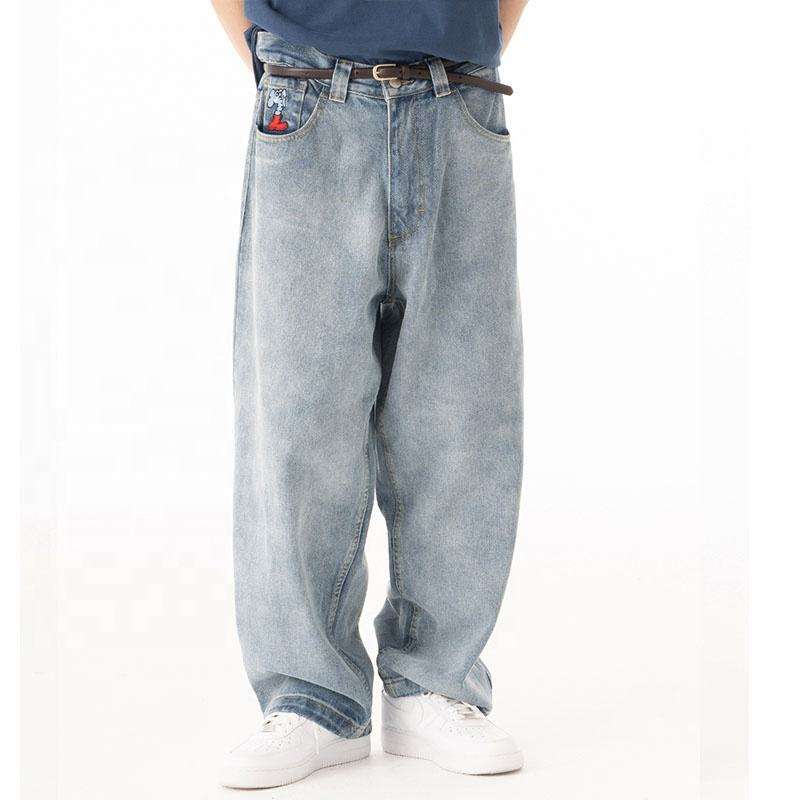 กางเกงยีนส์เดนิมทรงหลวมสีน้ำเงินแบบยูนิเซ็กซ์ สไตล์สตรีทแวร์ผู้ชาย รับผลิตตามแบบ (OEM) พร้อมตกแต่งด้วยงานปัก ทรงฮาเร็ม เหมาะสำหรับฤดูใบไม้ผลิ