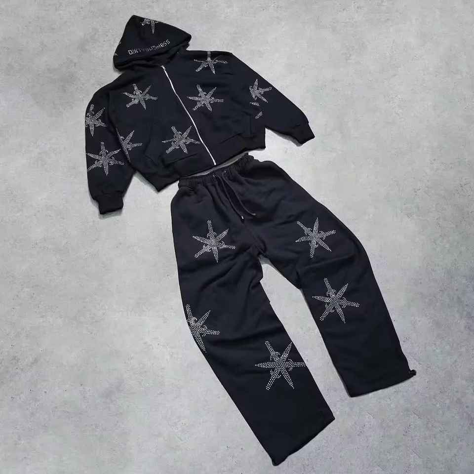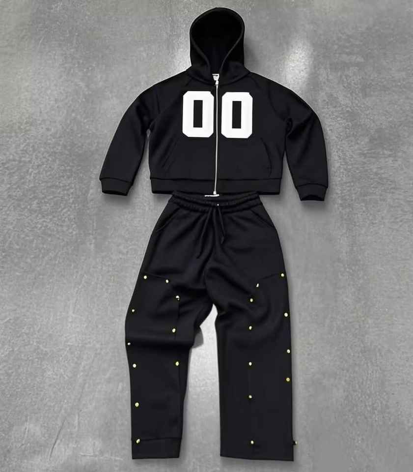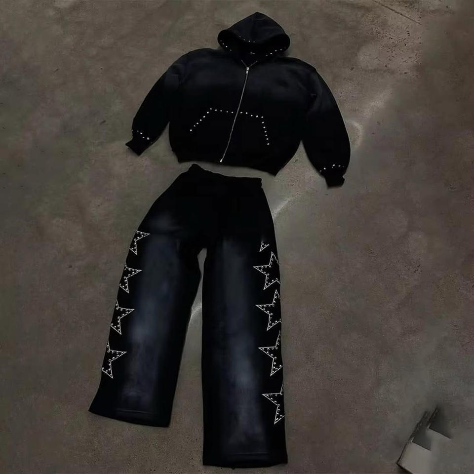 ชุดสูทแฟชั่นสตรีทแวร์พิมพ์ลายโลโก้ตามสั่งสำหรับทุกเพศ ทรงขาบาน ล้างสีแบบแอซิดวอช กระเป๋าแต่งหิน แขนเสื้อประดับหมุดโลหะ ชุดสเวตสูทกันแดดสีซีดสวยที่สุด