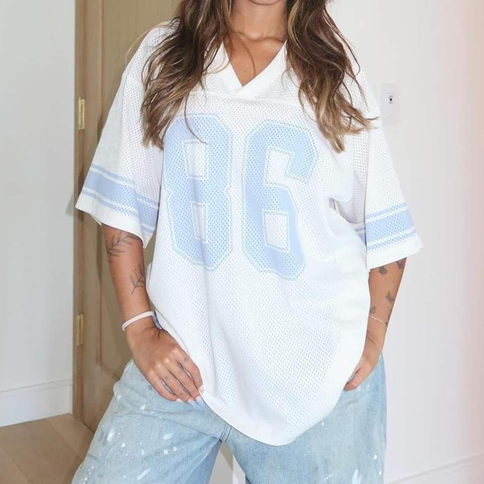 เสื้อฟุตบอลคอวีโอเวอร์ไซส์สำหรับทุกเพศเสื้อพิมพ์ลายระบายอากาศสำหรับผู้เล่นชายและหญิงสวมใส่สบายและมีสไตล์
