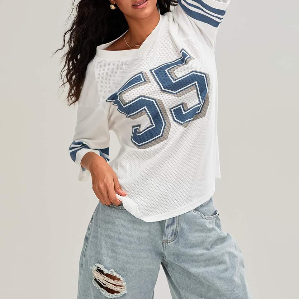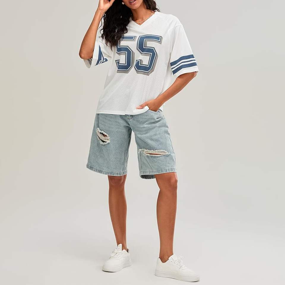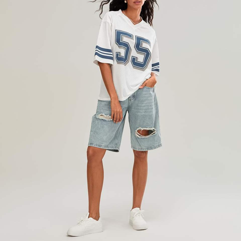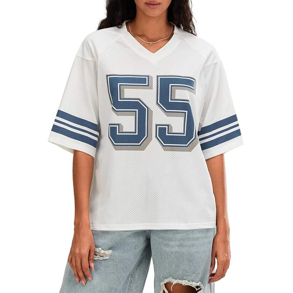 เสื้อบาสเก็ตบอลคอวีระบายอากาศได้สำหรับทุกเพศเสื้อยืดบ็อกซี่ขนาดใหญ่ Y2K ฟุตบอลพิมพ์ลายกราฟิก