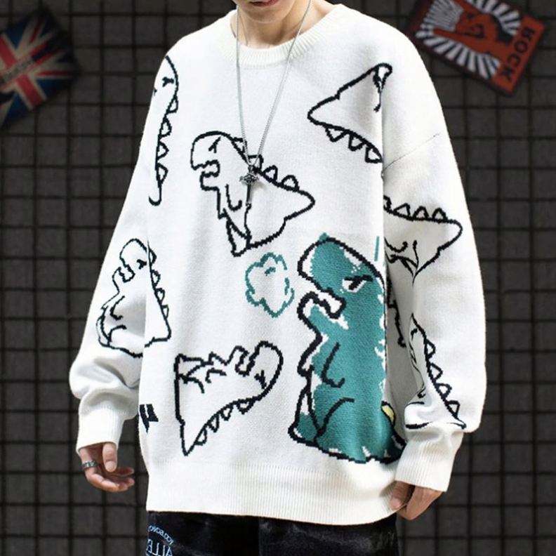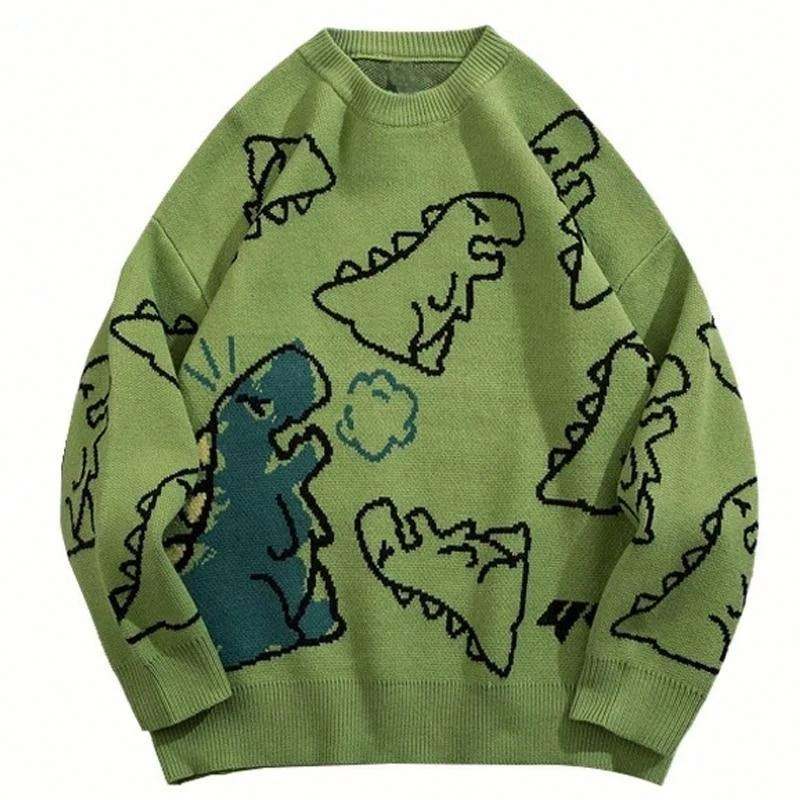 เสื้อสเวตเตอร์ถักลายไดโนเสาร์น่ารักใส่ได้ทั้งชายและหญิงผ้าฝ้ายระบายอากาศได้ดีป้องกันริ้วรอยแนวสตรีทฮาราจูกุแนวฮิปฮอปด้านหน้าโลโก้ขนาดพิเศษ