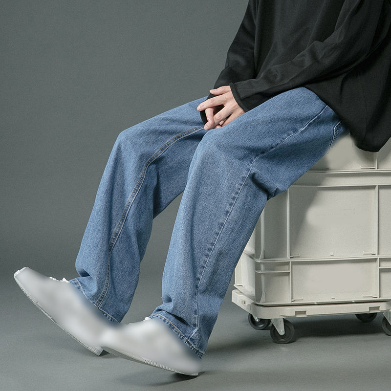 กางเกงยีนส์ใส่ได้ทั้งชายและหญิงสำหรับฤดูใบไม้ผลิกางเกงลำลองกางเกงยีนส์บางทรงหลวมเอวกลางสีทึบถักแบบทอ