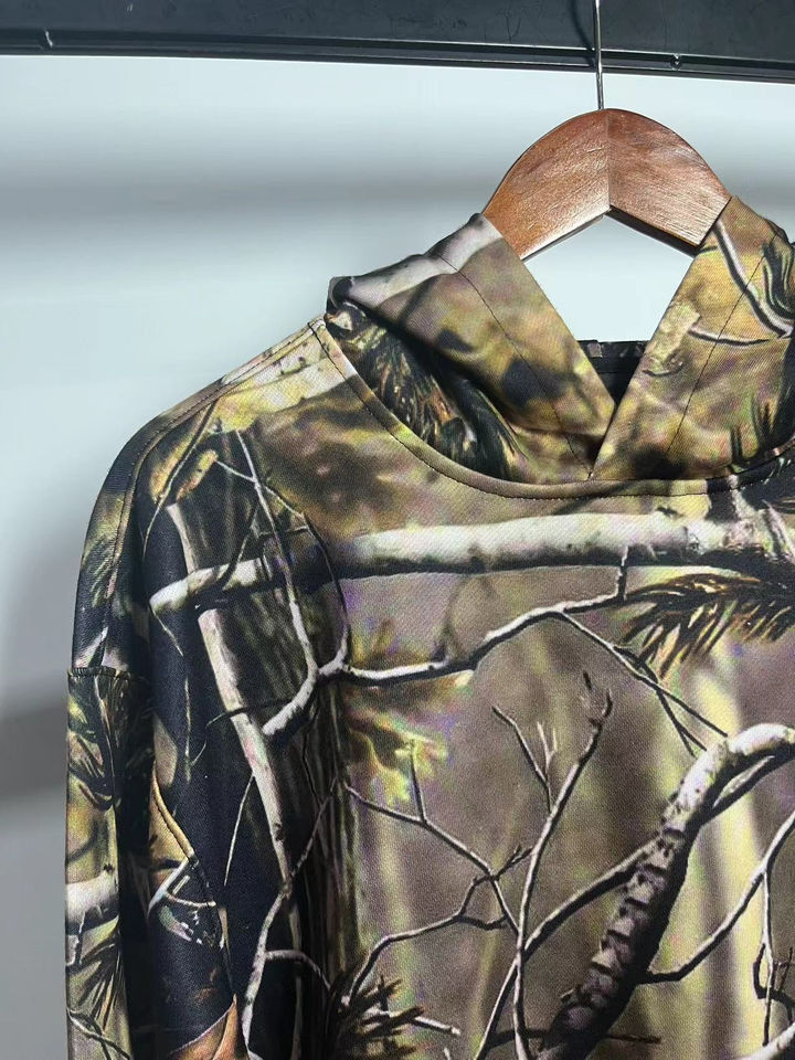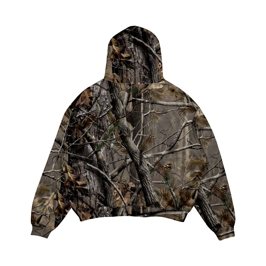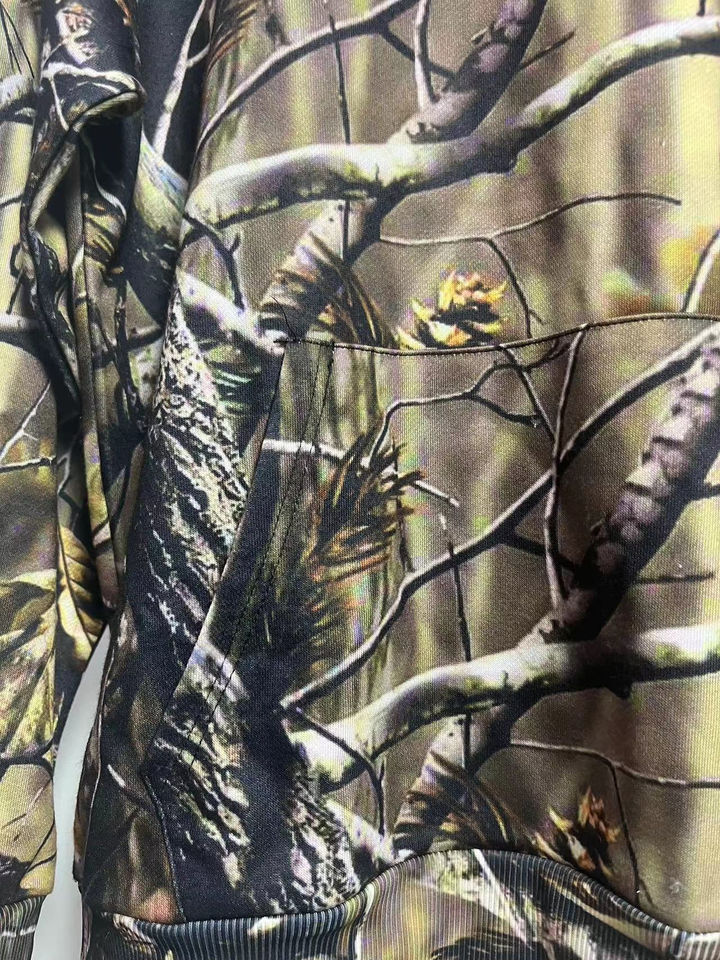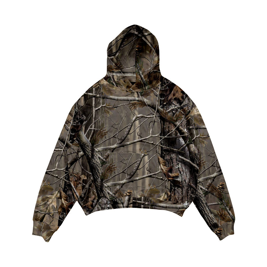 เสื้อฮู้ดดี้พิมพ์ลายต้นไม้ดิจิทัลแบบยูนิเซ็กซ์สำหรับฤดูใบไม้ร่วง เป็นมิตรกับสิ่งแวดล้อม ทรงโอเวอร์ไซส์ ล้างสีแบบแอซิดวอช ทรงบ็อกซี่ พิมพ์ลายทั่วตัว ปักลาย 100%