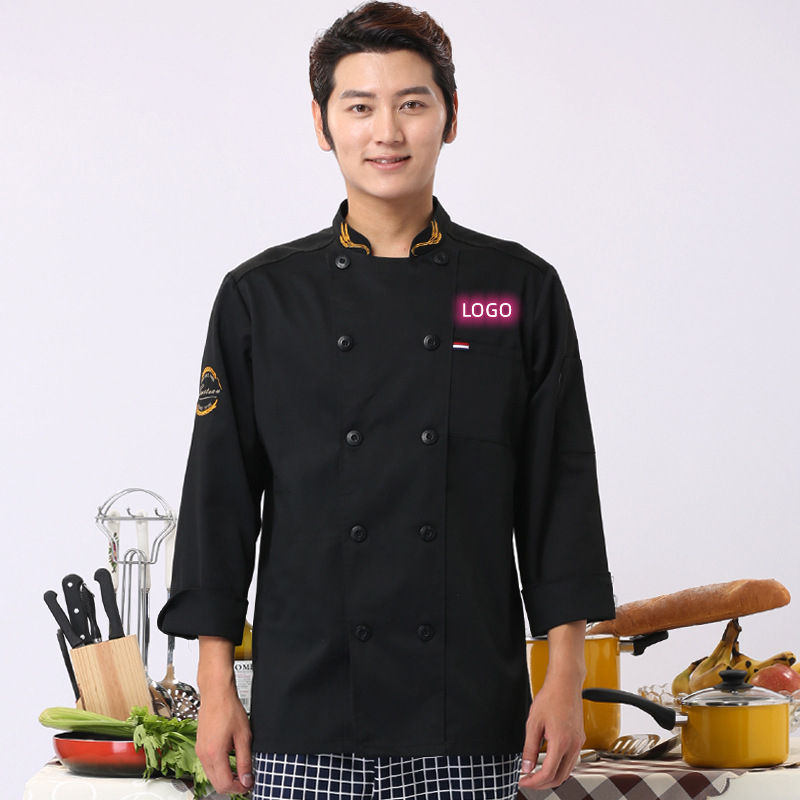 ชุดพนักงานเสริฟยูนิฟอร์มเครื่องแบบพนักงานร้านอาหารแจ็กเก็ตสำหรับพนักงานเชฟงานปักลายโลโก้แบบยูนิเซ็กส์