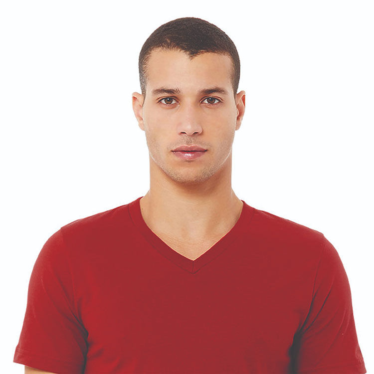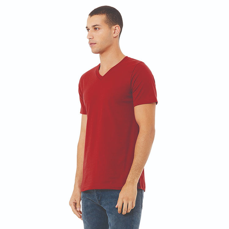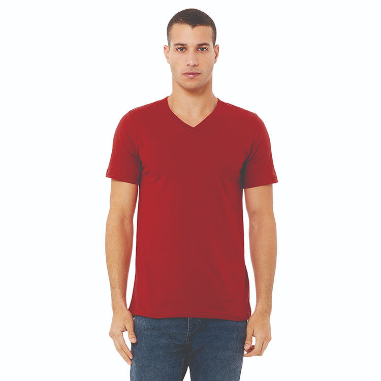เสื้อยืดคอวีแบบทางการสำหรับทุกเพศ ผลิตจากโพลีเอสเตอร์ 100% ป้องกันรอยยับ ระบายอากาศได้ดี ผ้าแคนวาส 32 เส้น หนัก 4.2 ออนซ์ สีแดง แขนสั้น