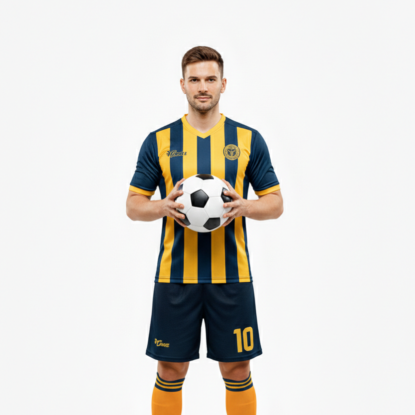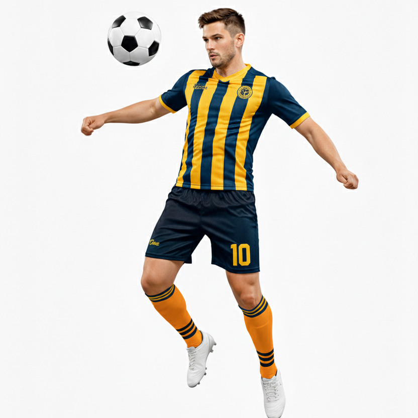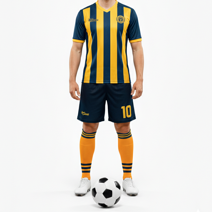 ชุดกีฬาแบบ unisex สีเหลืองดำลายทาง ดีไซน์ทันสมัย แห้งเร็ว เหมาะสำหรับฟุตบอล พร้อมโลโก้ด้านหน้าแบบกำหนดเองได้