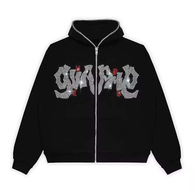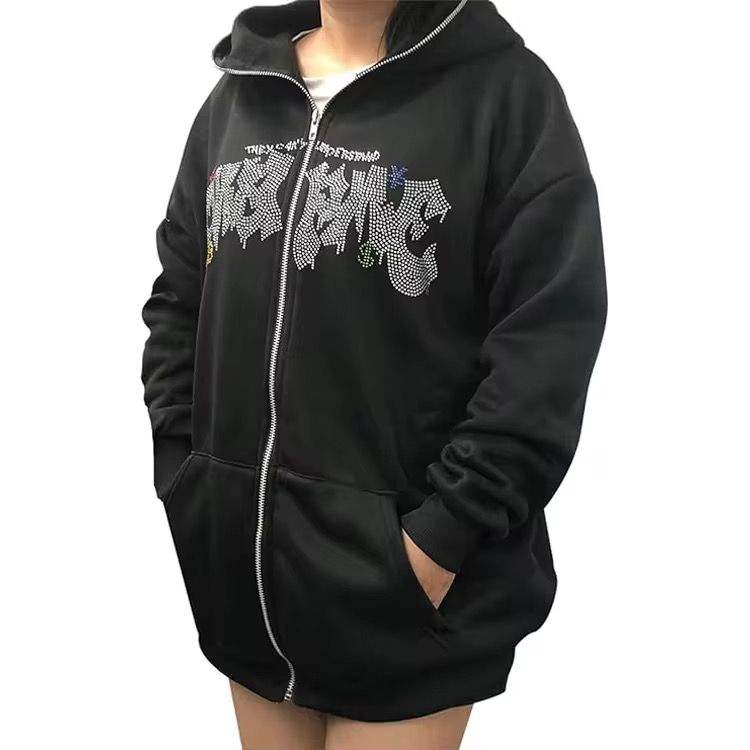 สเวตเชิ้ตประดับหมุดโลหะประดับพลอยเทียมทุกเพศ, เสื้อแนวสตรีทมีฮู้ดสไตล์กีฬาสวมใส่สบายสำหรับผู้ชายผู้หญิง