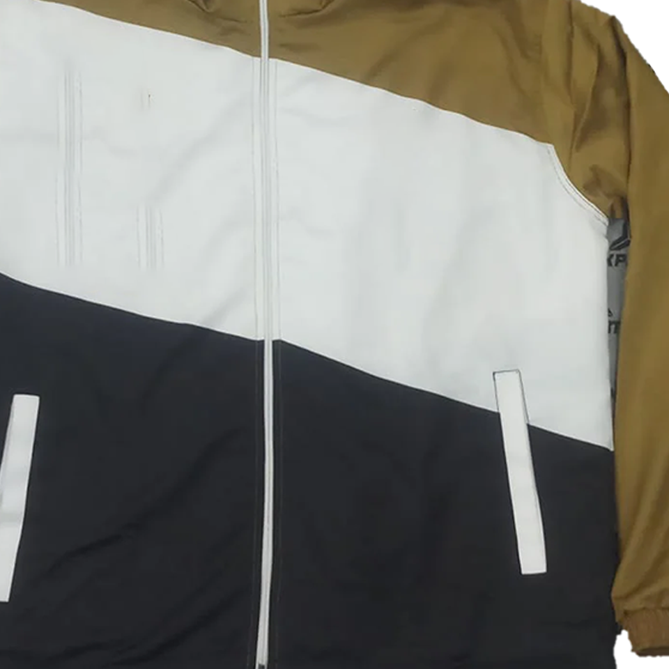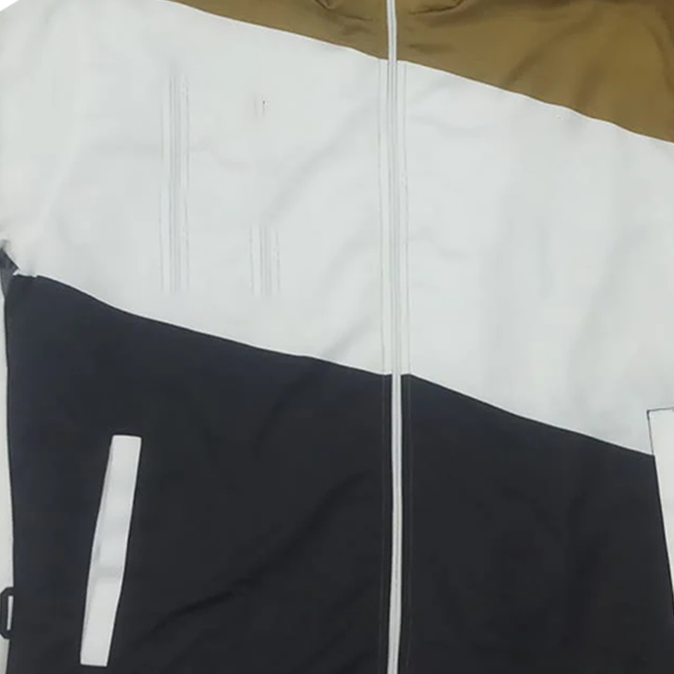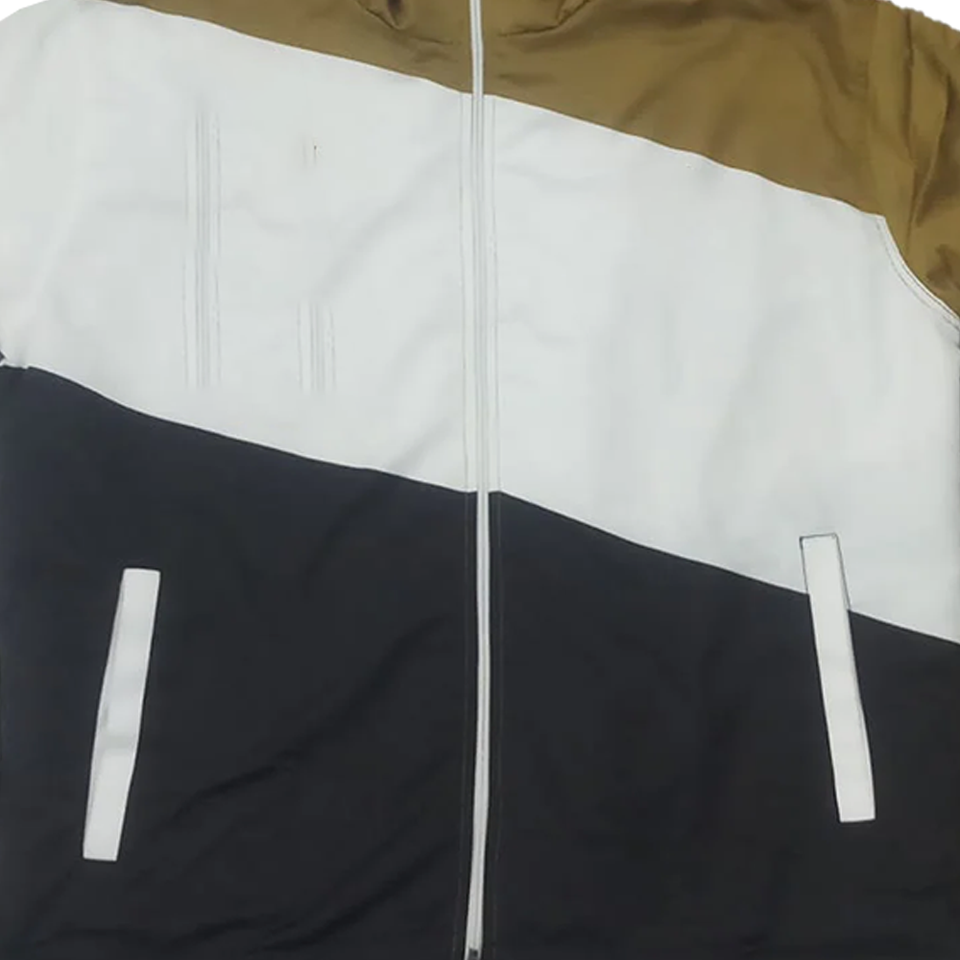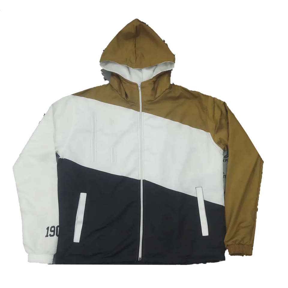 เสื้อแจ็คเก็ตกันลมแบบมีฮู้ด ยูนิเซ็กซ์ สีสันเรียบหรู ตัดต่อสีขาว ดำ ทอง ไซส์ใหญ่ กันน้ำ สไตล์ลำลองสำหรับกิจกรรมกลางแจ้ง