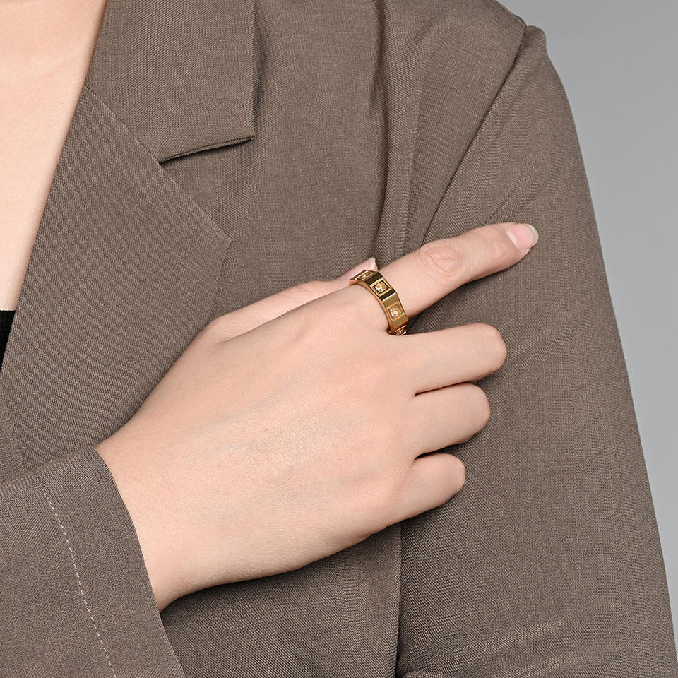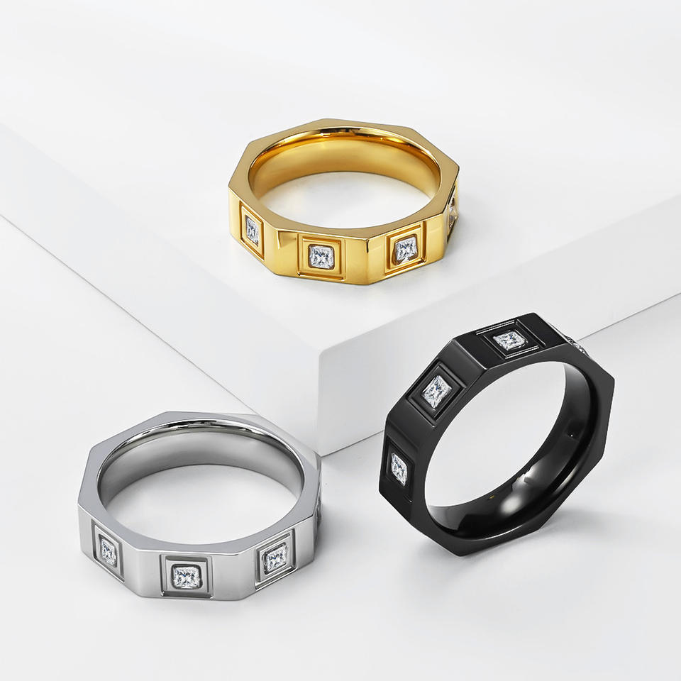 แหวนรูปทรงแปดเหลี่ยมเรขาคณิตสำหรับทุกเพศ ทำจากเหล็กสีทองดำ ประดับเพชรแบบหนามเตย ของขวัญเครื่องประดับ