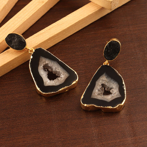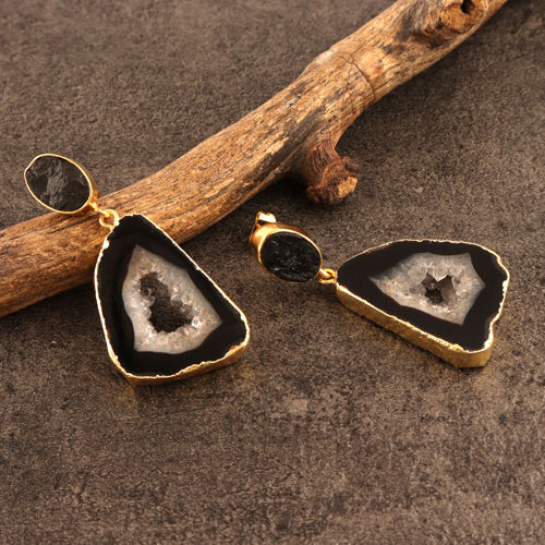 Unisex ชุบทองคริสตัลธรรมชาติต่างหูห้อยสีดำ Geode ชิ้นหินมดรุซี่ดิบทัวร์มาลีนเครื่องประดับทองเหลือง
