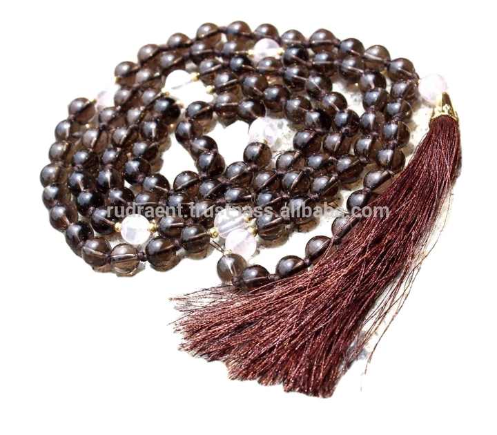 สร้อยมาลาควอตซ์สโมคกี้ขัดเงาเคลือบแว็กซ์ทำมือแบบยูนิเซ็กซ์ 108 เม็ดประดับพู่ห้อย ช่วยบำบัดจักระ เครื่องประดับอัญมณ์ทางศาสนา