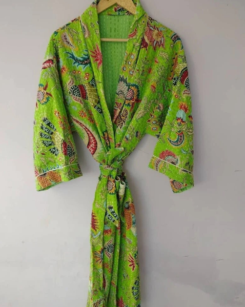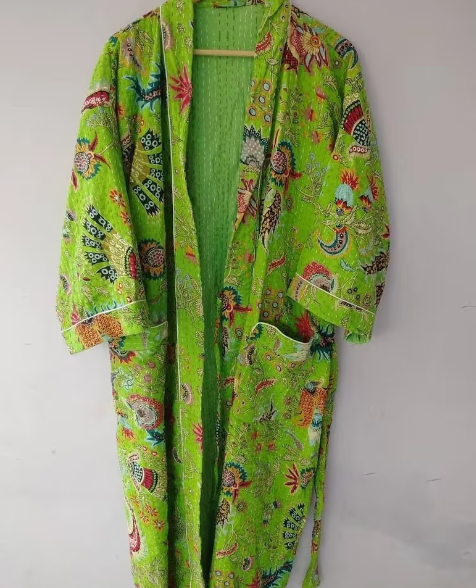 เสื้อคลุมอาบน้ำผ้าฝ้ายพิมพ์ลายเพสลีย์สีเขียวแบบยูนิเซ็กซ์ สไตล์โบโฮ คิโมโน คอวี แขนสามส่วน มีเชือกผูกเอว ทำด้วยมือ ผ้าฝ้าย 100%