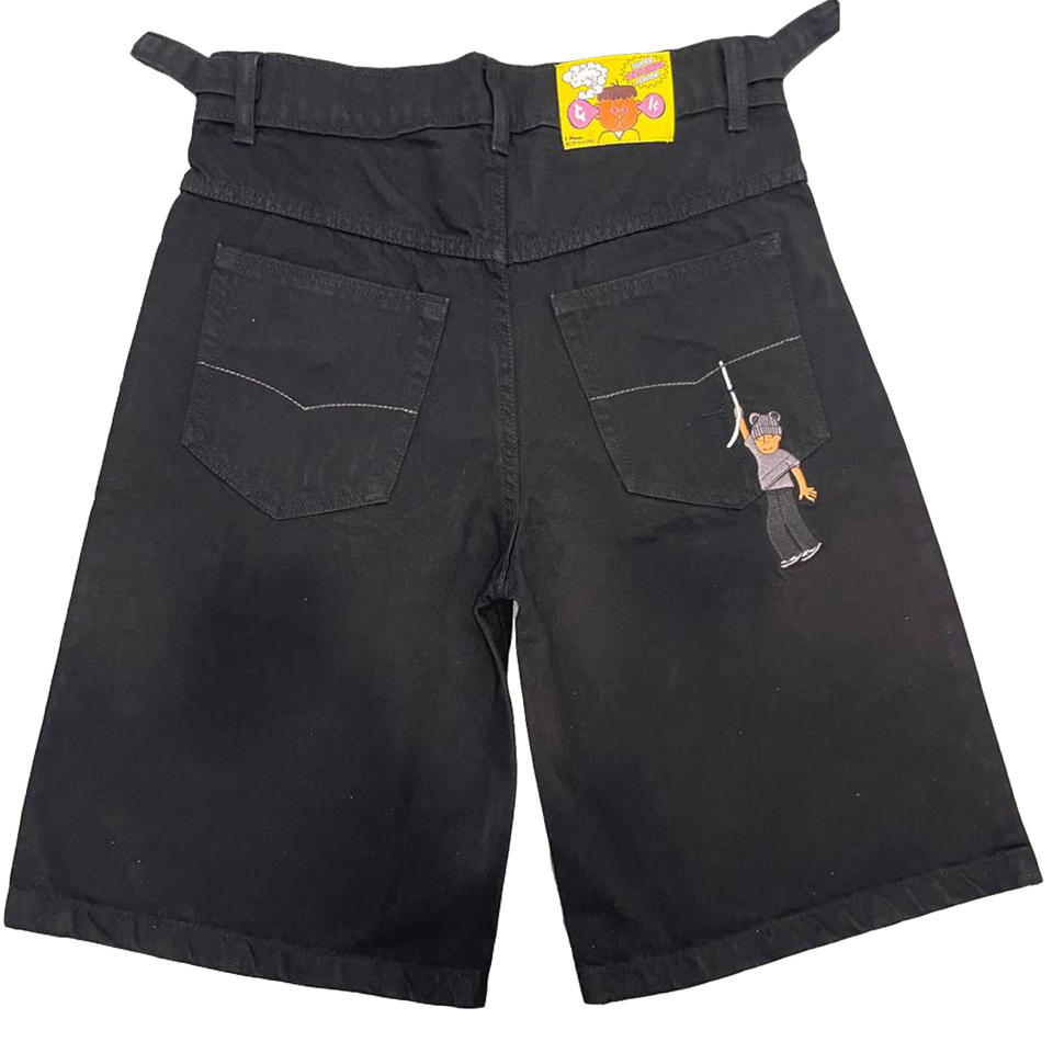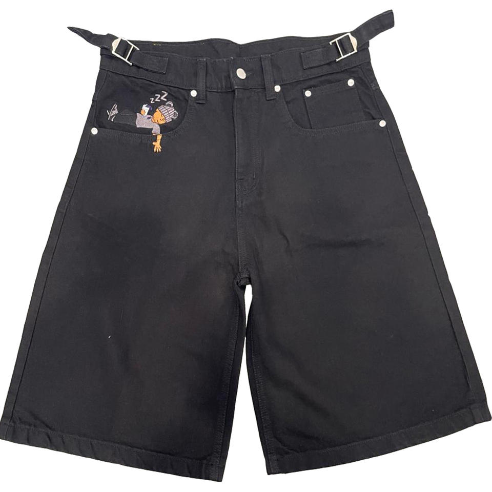 กางเกงยีนส์สำหรับทุกเพศเอวสูงวินเทจซักกางเกงขาสั้นถักปักด้วยเอวการ์ตูนปรับได้สำหรับฤดูร้อน