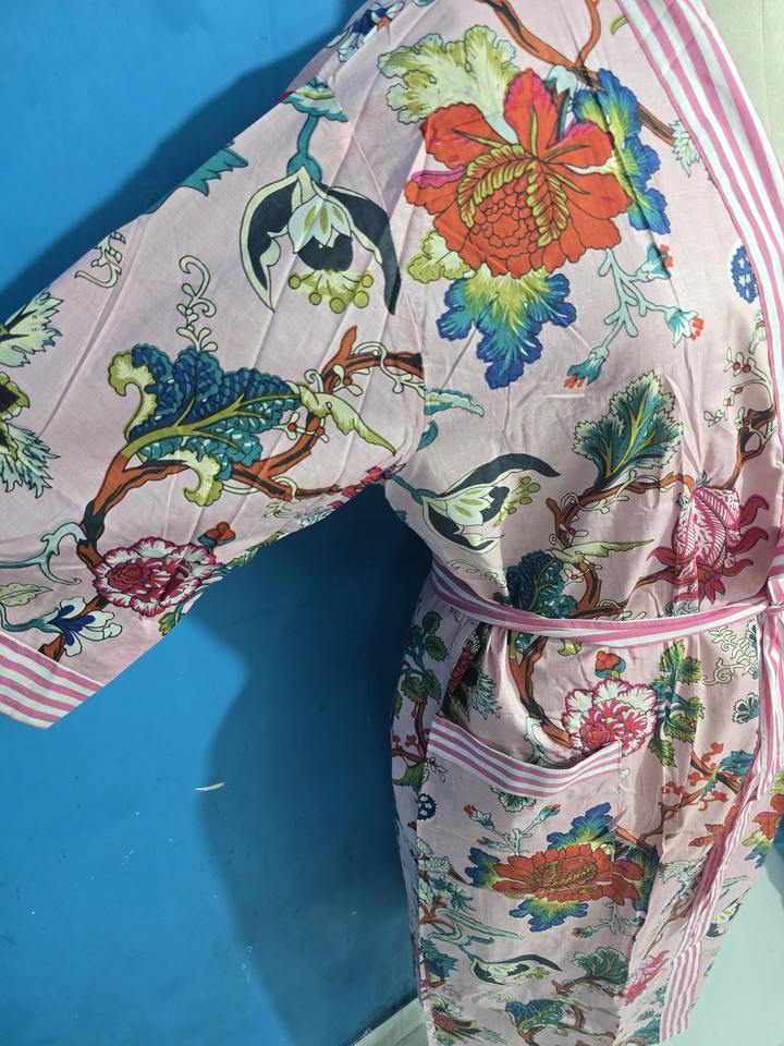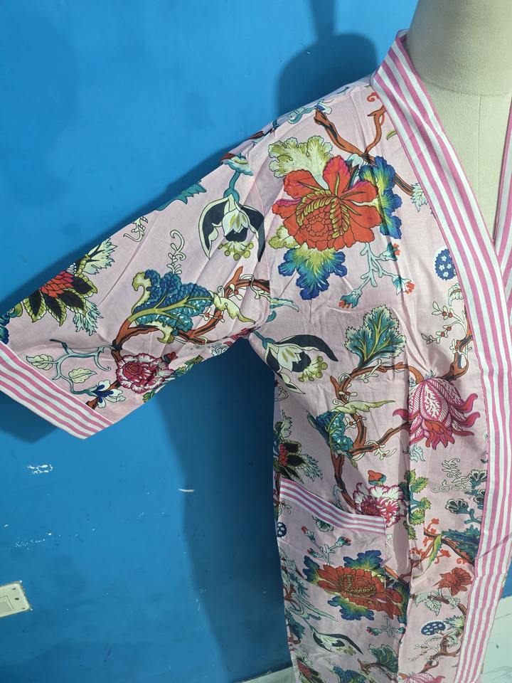 ชุดกิโมโนผ้าฝ้ายลายดอกสีชมพูสำหรับผู้หญิง สไตล์โบโฮ ชุดคลุมอาบน้ำ คอวี ผูกเอว ชุดสำหรับงานแต่งงาน ชุดลำลอง ชุดนอนฤดูร้อนและฤดูหนาว