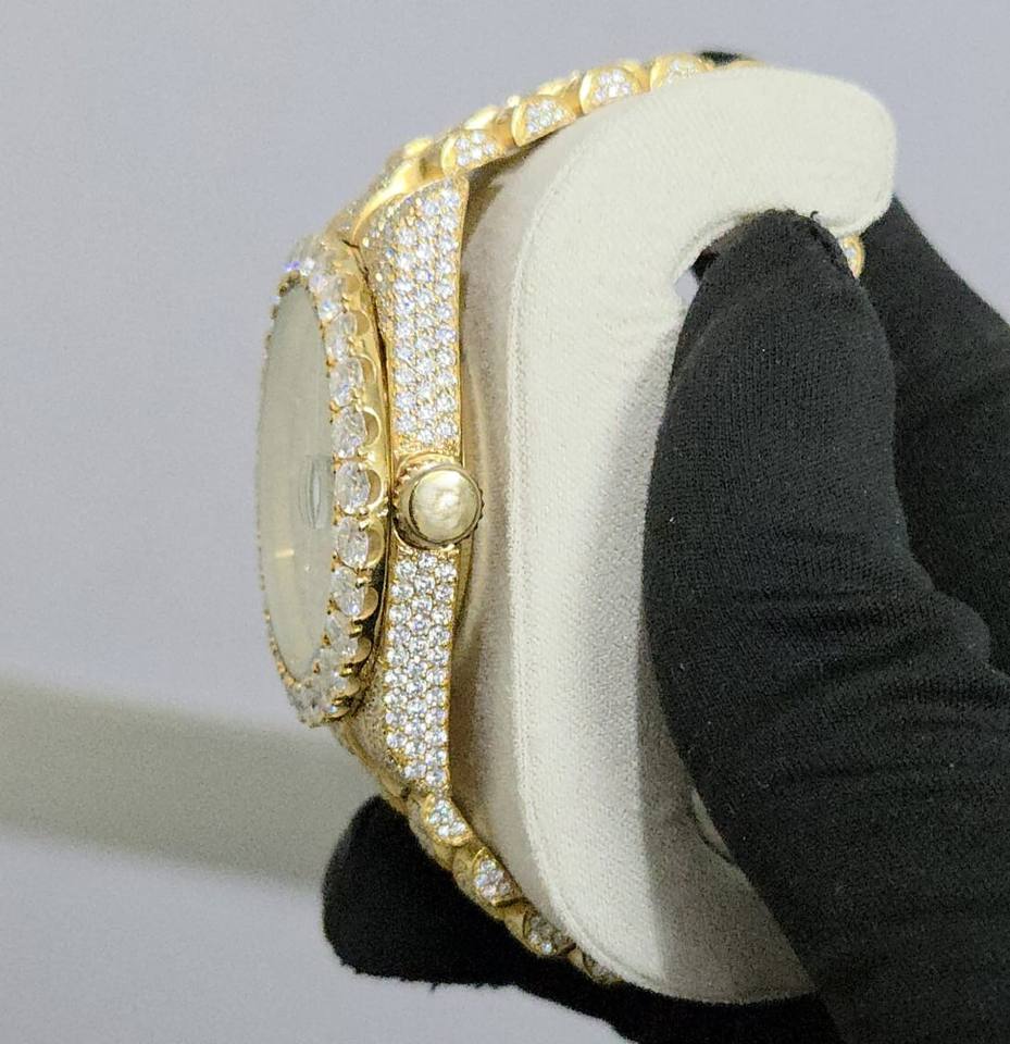 นาฬิกาเพชรอะนาล็อกสีเงินสุดหรู unisex ทำด้วยมือตัวเรือนสแตนเลสหน้าปัดกระจกเย็นเต็มรูปแบบวันที่41มม.