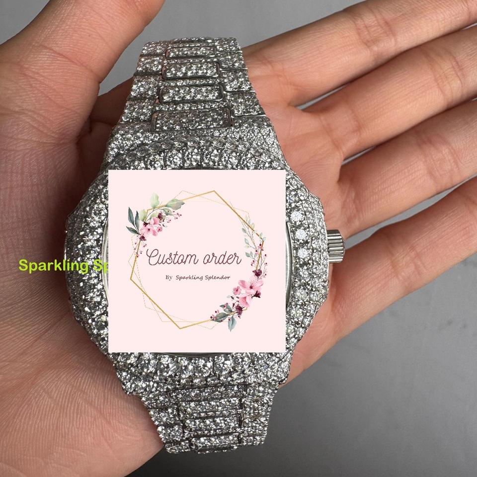 นาฬิกาข้อมือสแตนเลสสตีลทรงสี่เหลี่ยมประดับเพชรโมอิสซาไนต์ VVS และคริสตัลแซฟไฟร์ แบบยูนิเซ็กซ์ ผลิตตามสั่งจากโรงงาน หน้าปัดแบบอนาล็อก ผ่านการทดสอบเพชร