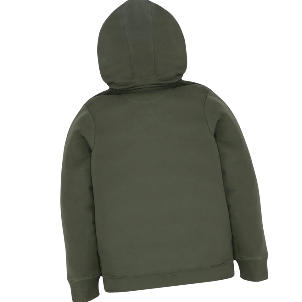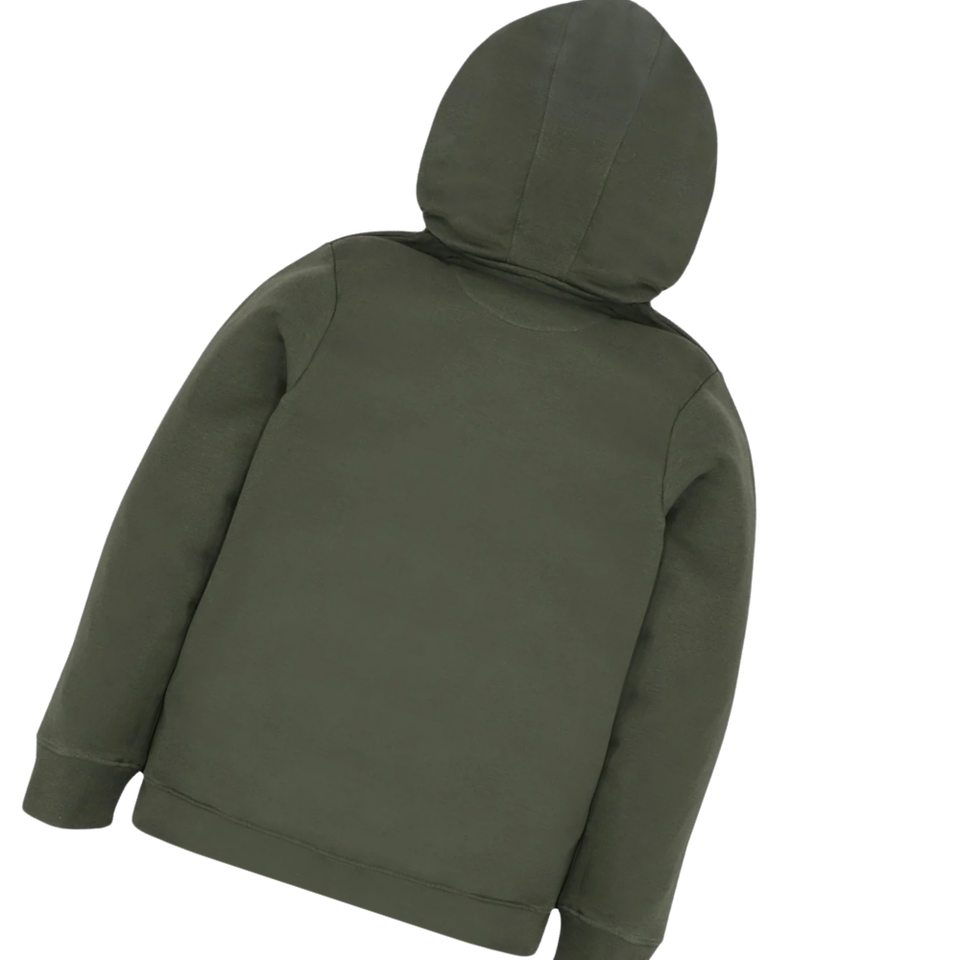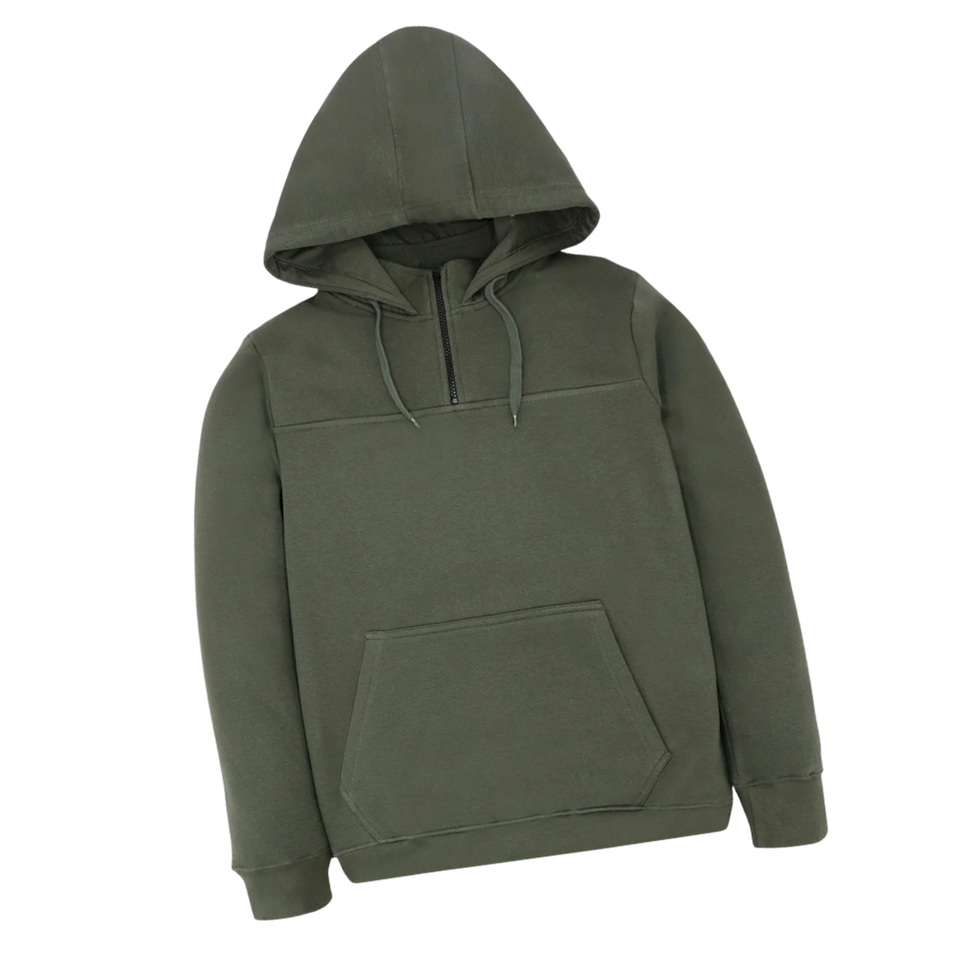 เสื้อมีฮู้ดแบบรูดซิปครึ่งสีเขียวมะกอกสำหรับทุกเพศเสื้อกันหนาวแบบสวมหัวผ้าคอตตอนเนื้อนุ่มมีกระเป๋าจิงโจ้และมีฮู้ดแบบปรับได้