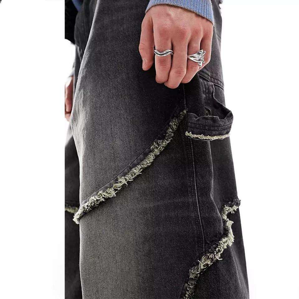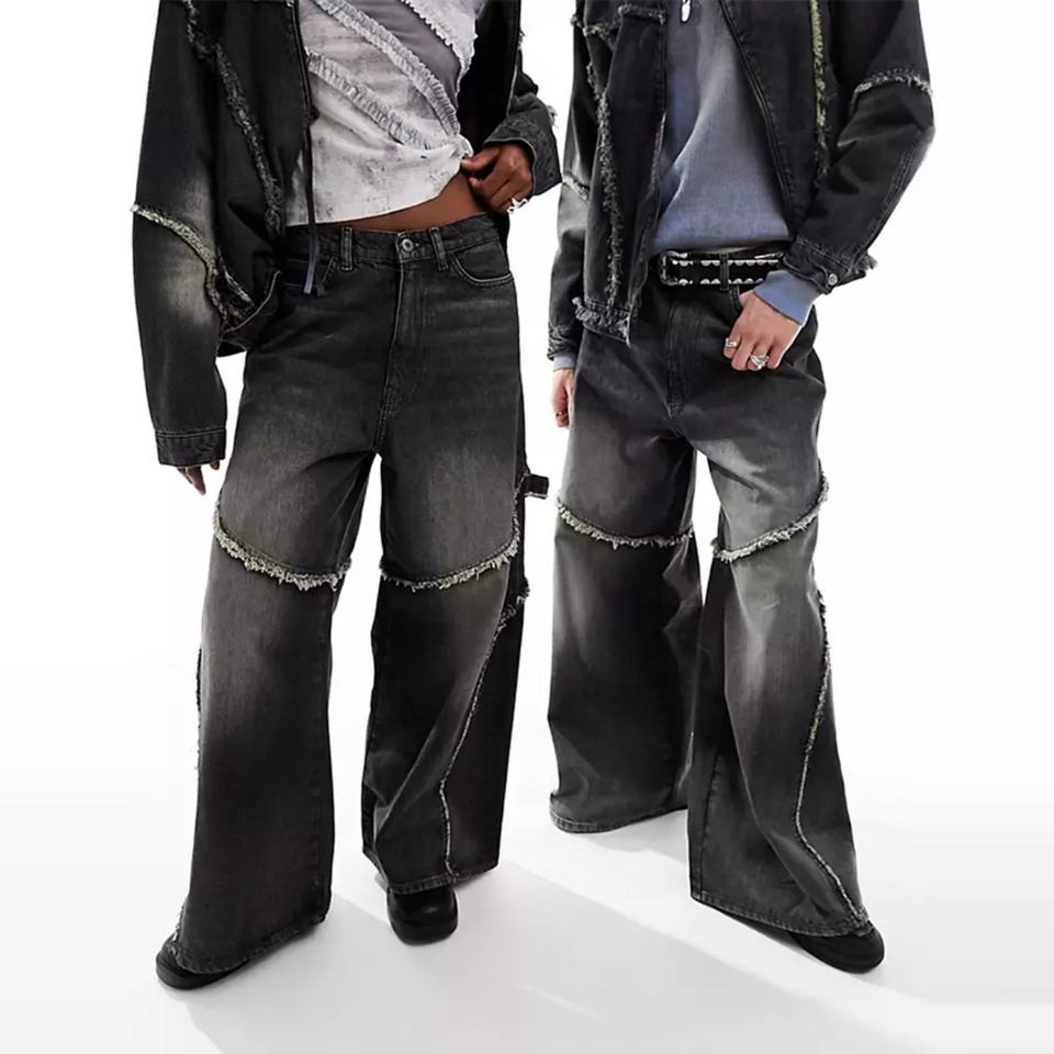 กางเกงยีนส์ทรงโอเวอร์ไซส์สีดำไล่เฉดแบบยูนิเซ็กซ์ แฟชั่นขาดๆ แต่งผ้าปะติด ทรงขากว้าง สไตล์ไฮสตรีท วินเทจ ลุคซักฟอก