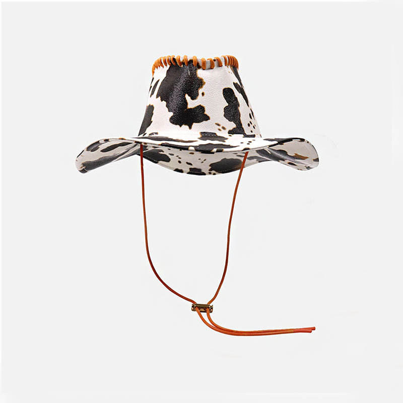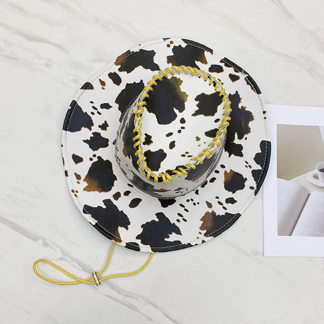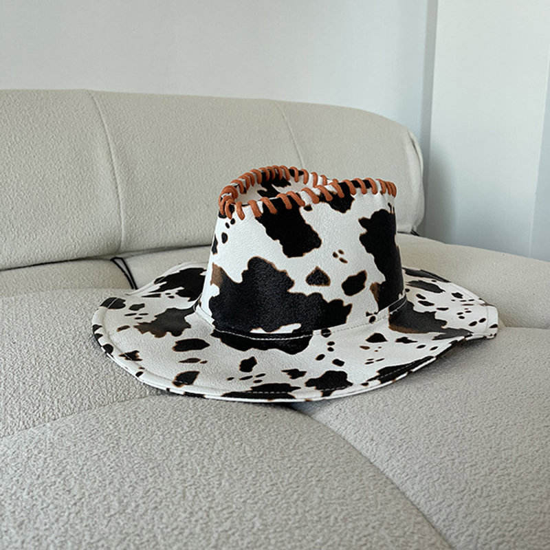 หมวกคาวบอยลายหนังวัวหนัง PU แบบยูนิเซ็กซ์ สำหรับผู้ชายและผู้หญิง สวมใส่ได้ทั้งในชีวิตประจำวันและกิจกรรมกลางแจ้ง เหมาะสำหรับการเดินทางและงานปาร์ตี้ สไตล์ขนสัตว์เทียม