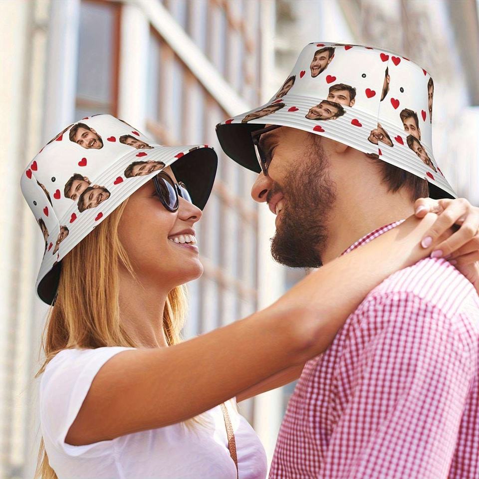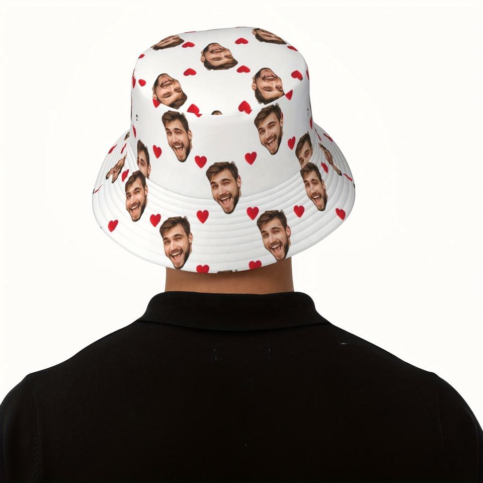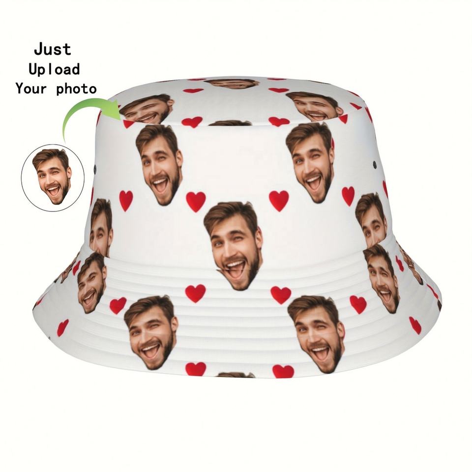 หมวกทรงถังใส่ภาพส่วนบุคคลใช้ได้ทั้งชายและหญิงลายพิมพ์ความรักสไตล์ชาวประมงที่มีลวดลายการ์ตูนผ้าทอหนึ่งชิ้นของขวัญที่กำหนดเอง