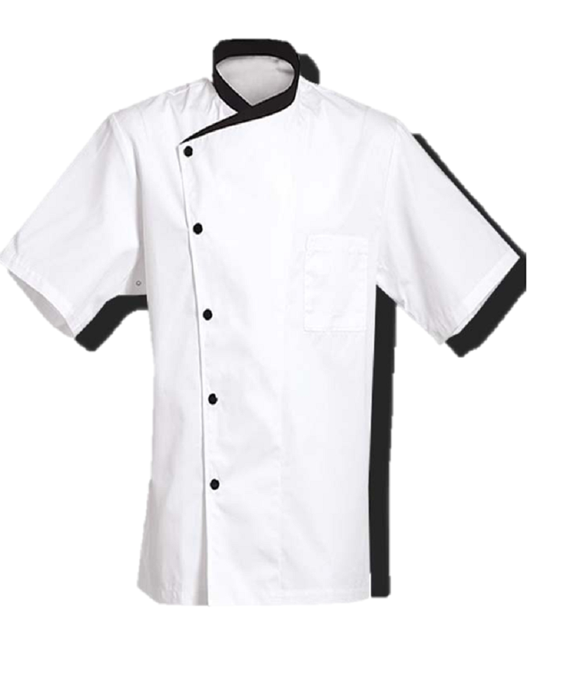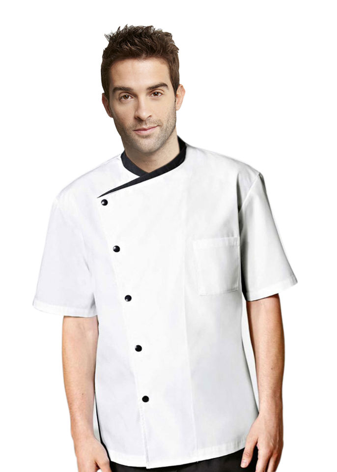 เสื้อโค้ทเชฟมืออาชีพสำหรับทุกเพศแขนสั้นคอสีตัดกันสำหรับทำอาหารบริการอาหารร้านอาหารบาร์บาร์ร้านอาหาร