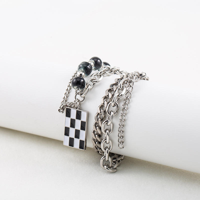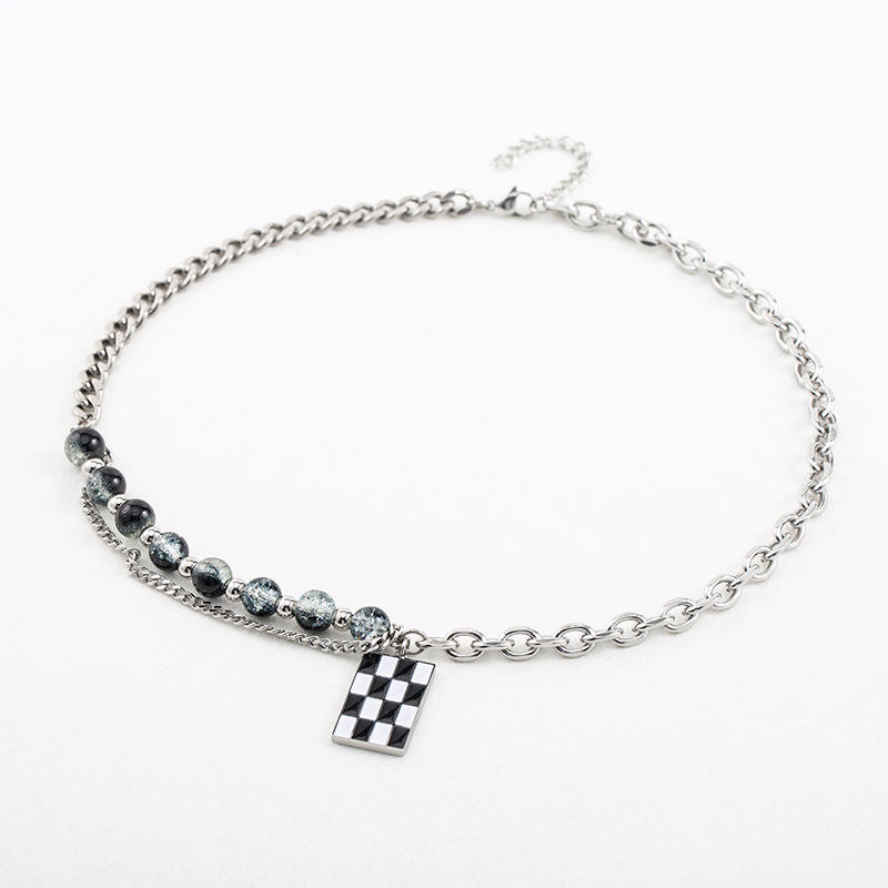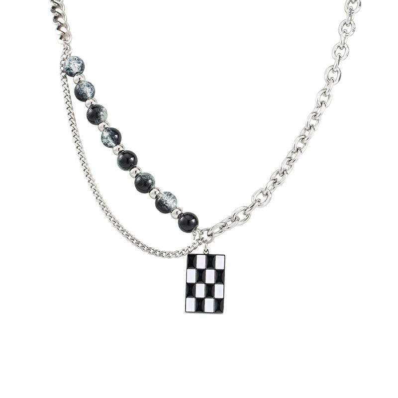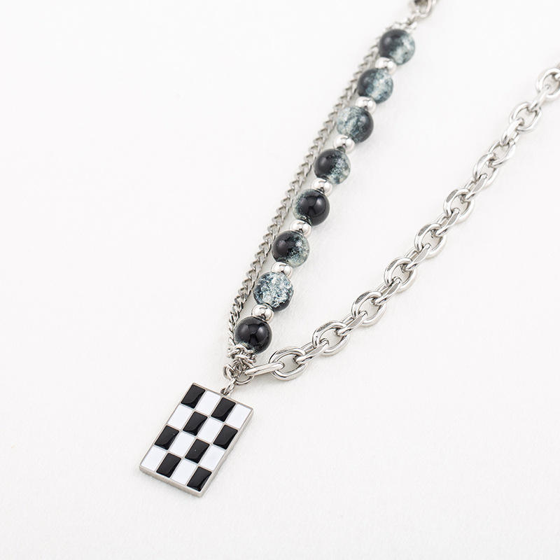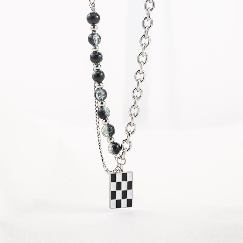 สร้อยคอสไตล์พังก์แบบยูนิเซ็กซ์ ทำจากไทเทเนียมสตีล ประดับลูกปัดเคลือบสีดำขาว ลายตารางหมากรุก ดีไซน์เรขาคณิต เครื่องประดับแฟชั่น