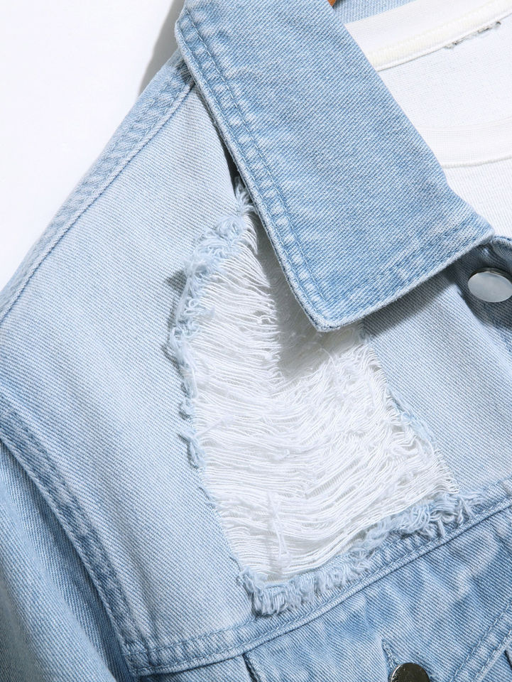 แจ็คเก็ตยีนส์ขาดๆ สไตล์ยูนิเซ็กซ์ สีฟ้าอ่อน แบบดิสเทรส ระบายอากาศได้ดี เหมาะสำหรับฤดูหนาว ทรงสลิม ใส่สบาย สไตล์สตรีทแวร์ ฮิปฮอป เสื้อคลุมสไตล์เรโทร